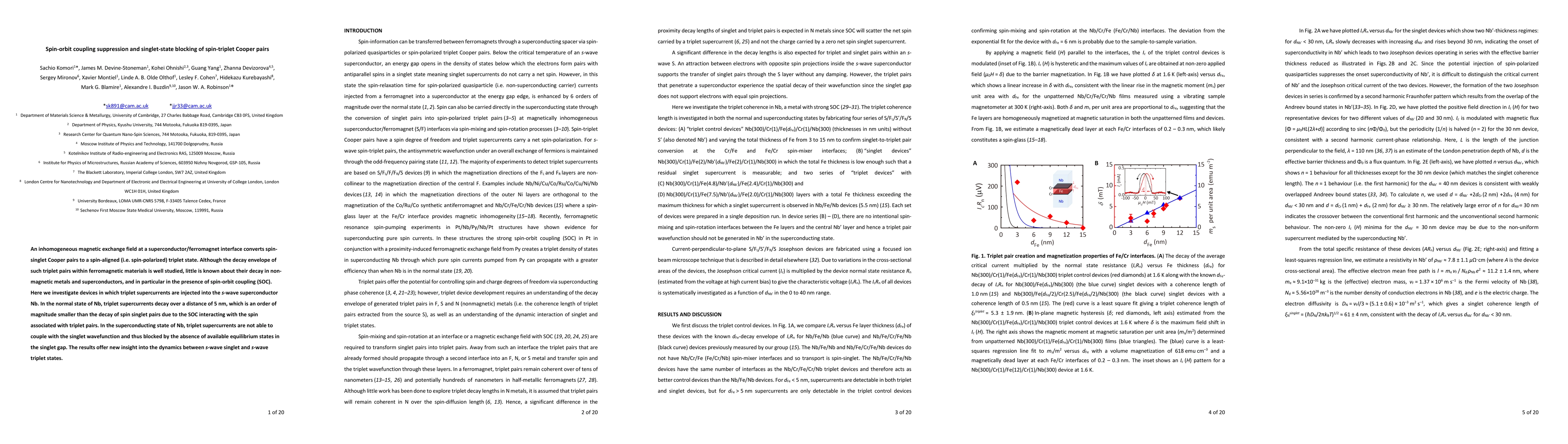 This paper investigates the suppression of spin-orbit coupling and blocking of spin-triplet Cooper pairs in s-wave superconductor Nb, showing that triplet supercurrents decay significantly faster in non-magnetic metals due to SOC and are blocked in the superconducting state by the lack of singlet states.