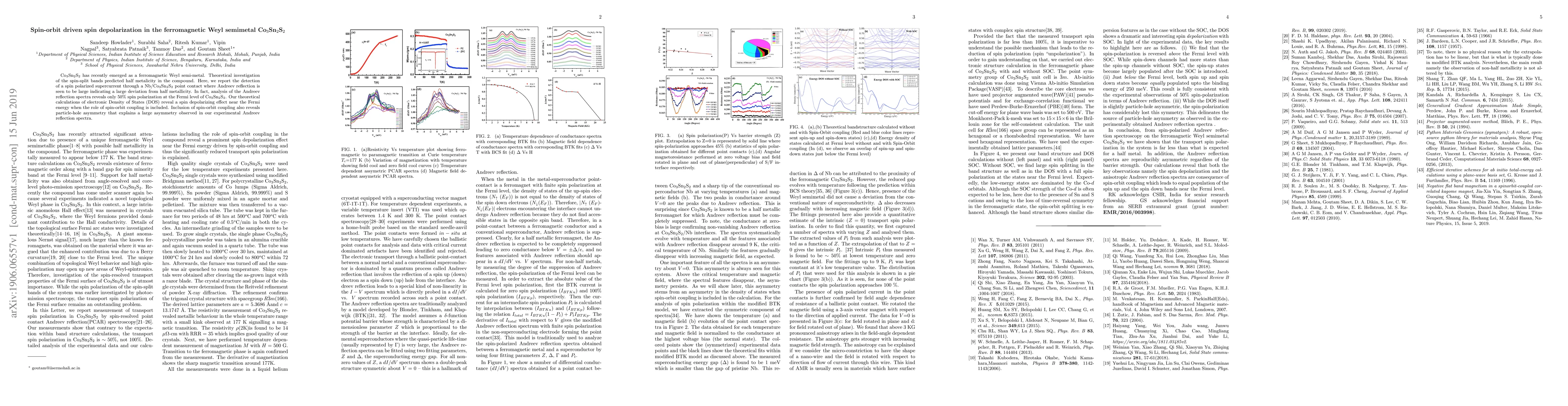 Co$_3$Sn$_2$S$_2$ has recently emerged as a ferromagnetic Weyl semi-metal. Theoretical investigation of the spin-split bands predicted half metalicity in the compound. Here, we report the detection of a spin polarized supercurrent through a Nb/Co$_3$Sn$_2$S$_2$ point contact where Andreev reflection is seen to be large indicating a large deviation from half metallicity. In fact, analysis of the Andreev reflection spectra reveals only 50\% spin polarization at the Fermi level of Co$_3$Sn$_2$S$_2$. Our theoretical calculations of electronic Density of States (DOS) reveal a spin depolarizing effect near the Fermi energy when the role of spin-orbit coupling is included. Inclusion of spin-orbit coupling also reveals particle-hole asymmetry that explains a large asymmetry observed in our experimental Andreev reflection spectra.