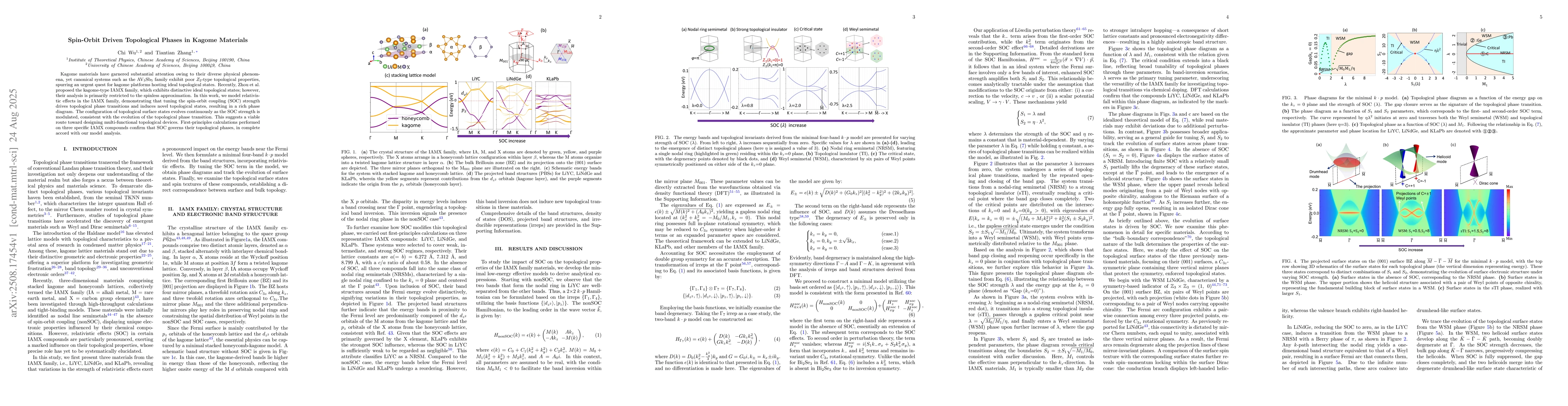 Kagome materials have garnered substantial attention owing to their diverse physical phenomena, yet canonical systems such as the AV$_3$Sb$_5$ family exhibit poor $Z_{2}$-type topological properties, spurring an urgent quest for kagome platforms hosting ideal topological states. Recently, Zhou et al. proposed the kagome-type IAMX family, which exhibits distinctive ideal topological states; however, their analysis is primarily restricted to the spinless approximation. In this work, we model relativistic effects in the IAMX family, demonstrating that tuning the spin-orbit coupling (SOC) strength drives topological phase transitions and induces novel topological states, resulting in a rich phase diagram. The configuration of topological surface states evolves continuously as the SOC strength is modulated, consistent with the evolution of the topological phase transition. This suggests a viable route toward designing multi-functional topological devices. First-principles calculations performed on three specific IAMX compounds confirm that SOC governs their topological phases, in complete accord with our model analysis.