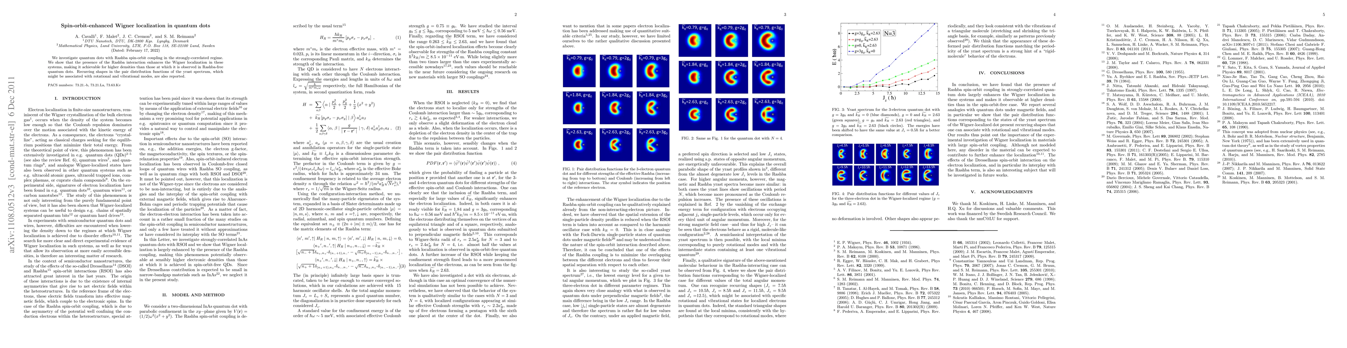 We investigate quantum dots with Rashba spin-orbit coupling in the strongly-correlated regime. We show that the presence of the Rashba interaction enhances the Wigner localization in these systems, making it achievable for higher densities than those at which it is observed in Rashba-free quantum dots. Recurring shapes in the pair-correlated densities of the yrast spectrum, which might be associated with rotational and vibrational modes, are also reported.