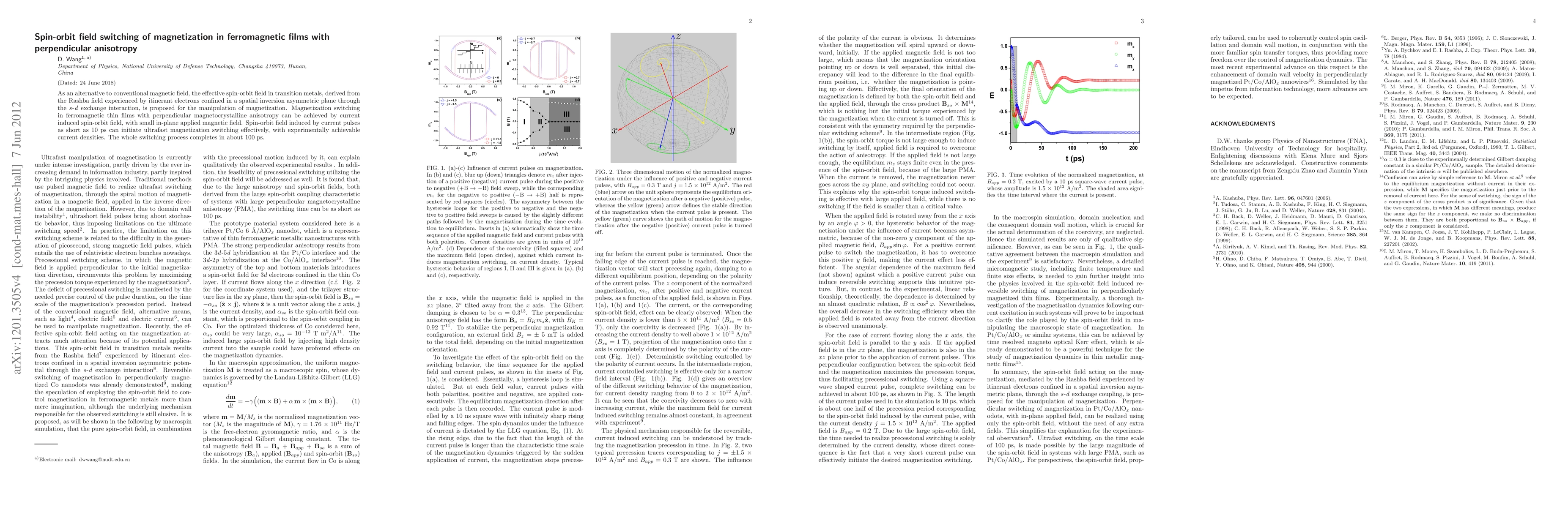 Summary: The research proposes using the spin-orbit field from transition metals to manipulate magnetization in ferromagnetic films with perpendicular anisotropy, achieving ultrafast magnetization switching via short current pulses. The entire switching process occurs within approximately 100 ps with experimentally feasible current densities.