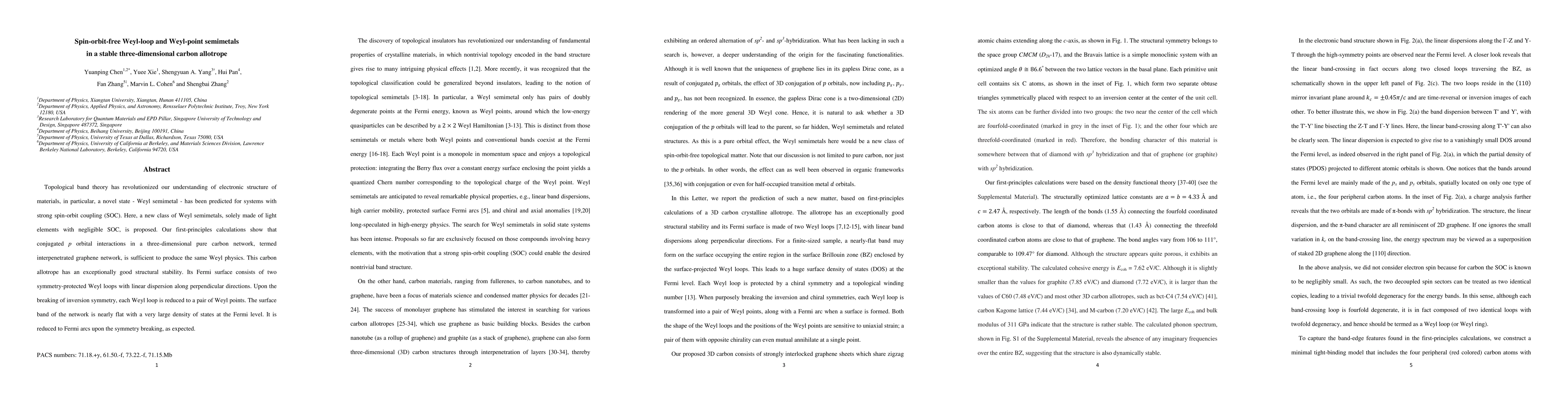 This paper proposes a novel spin-orbit-free Weyl semimetal based on a stable three-dimensional carbon allotrope termed interpenetrated graphene network. The study demonstrates that conjugated p orbital interactions in this structure can produce Weyl physics without strong spin-orbit coupling, featuring Weyl loops and points with a nearly flat surface band.