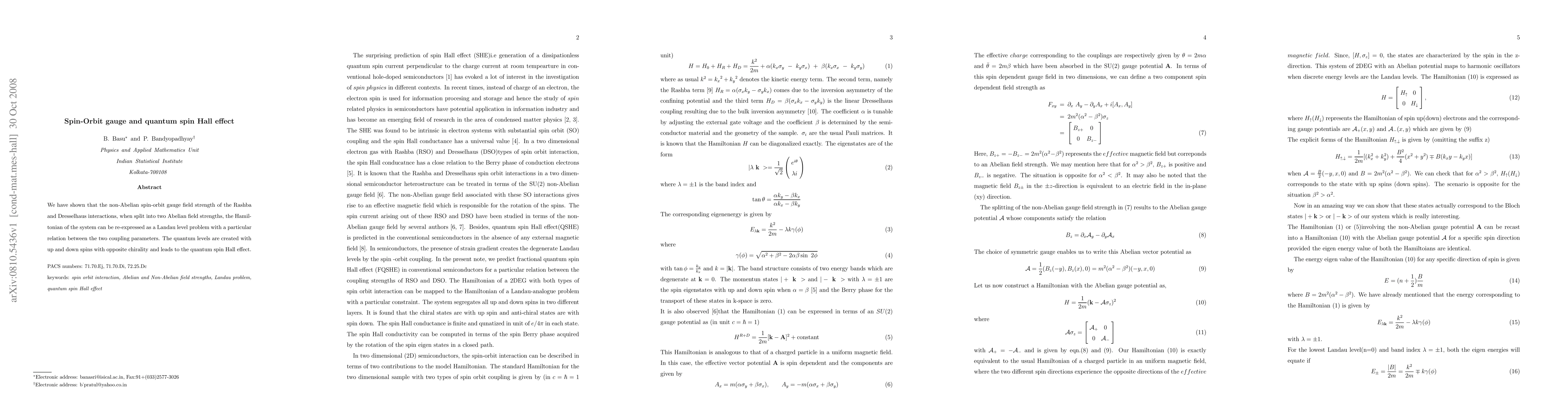 We have shown that the non-Abelian spin-orbit gauge field strength of the Rashba and Dresselhaus interactions, when split into two Abelian field strengths, the Hamiltonian of the system can be re-expressed as a Landau level problem with a particular relation between the two coupling parameters. The quantum levels are created with up and down spins with opposite chirality and leads to the quantum spin Hall effect.