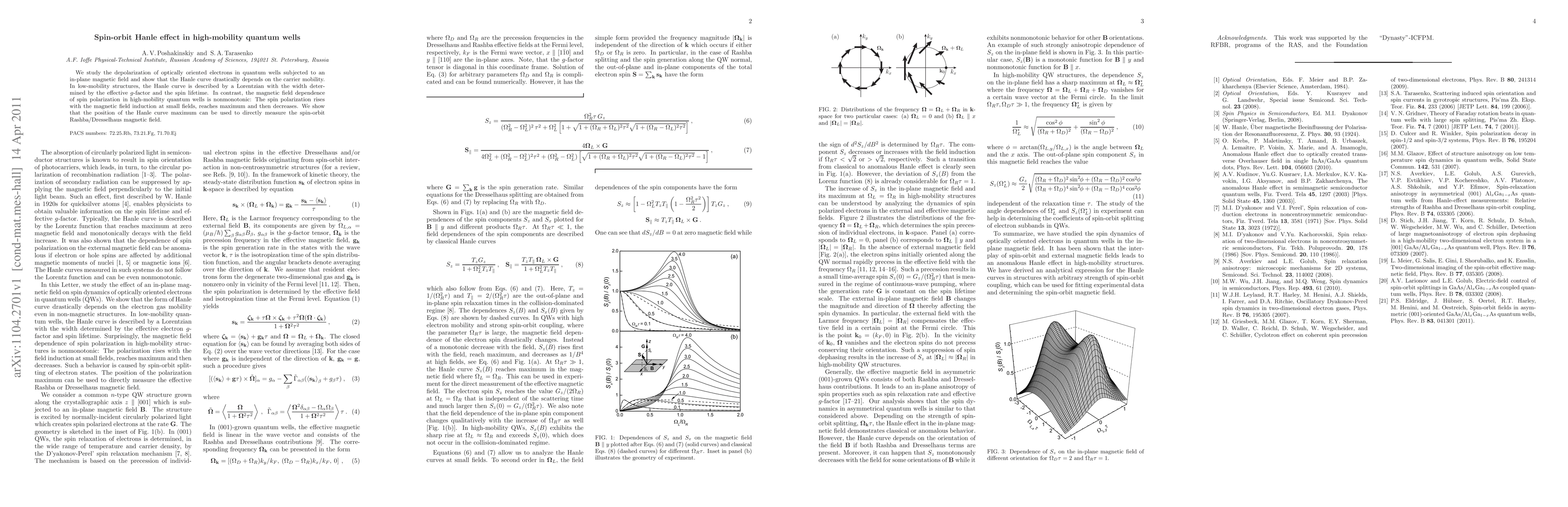 This paper investigates the spin-orbit Hanle effect in high-mobility quantum wells, revealing that the Hanle curve's shape varies significantly with carrier mobility. In high-mobility quantum wells, the spin polarization exhibits a nonmonotonic magnetic field dependence, with a maximum that can be used to measure the spin-orbit Rashba/Dresselhaus magnetic field.