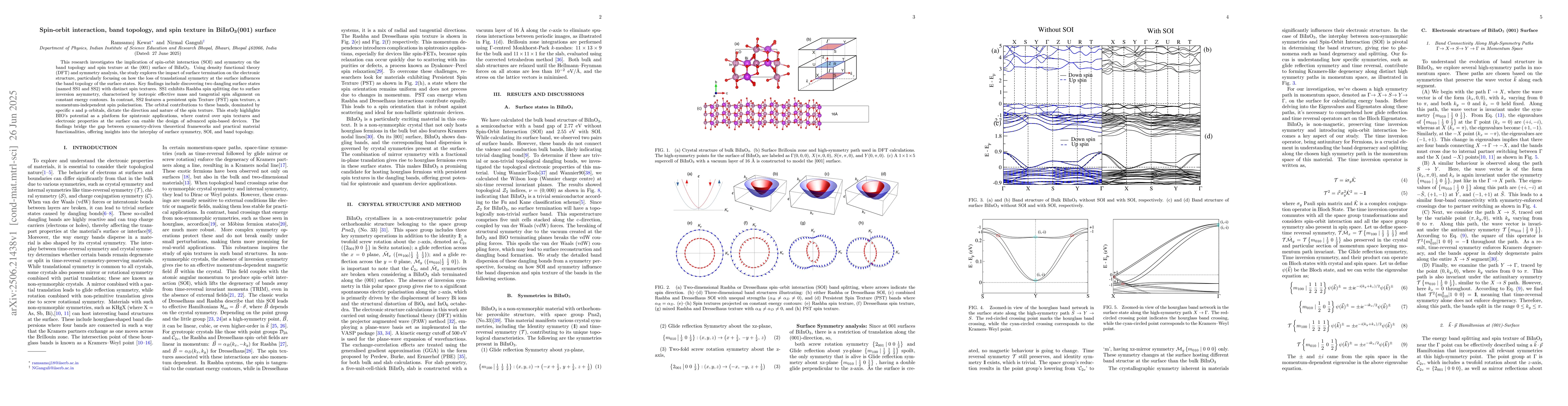 This research investigates the implication of spin-orbit interaction (SOI) and symmetry on the band topology and spin texture at the (001) surface of BiInO$_3$. Using density functional theory (DFT) and symmetry analysis, the study explores the impact of surface termination on the electronic structure, particularly focusing on how the loss of translational symmetry at the surface influences the band topology of the surface states. Key findings include discovering two dangling surface states (named SS1 and SS2) with distinct spin textures. SS1 exhibits Rashba spin splitting due to surface inversion asymmetry, characterised by isotropic effective mass and tangential spin alignment on constant energy contours. In contrast, SS2 features a persistent spin Texture (PST) spin texture, a momentum-independent spin polarisation. The orbital contributions to these bands, dominated by specific s and p orbitals, dictate the direction and nature of the spin texture. This study highlights BIO's potential as a platform for spintronic applications, where control over spin textures and electronic properties at the surface can enable the design of advanced spin-based devices. The findings bridge the gap between symmetry-driven theoretical frameworks and practical material functionalities, offering insights into the interplay of surface symmetry, SOI, and band topology.