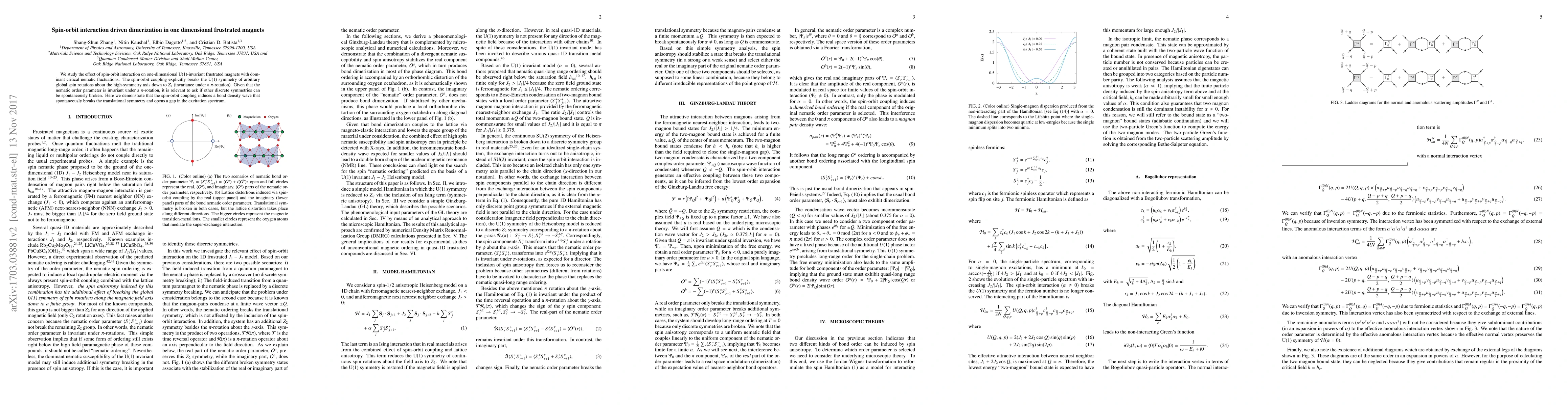 This paper investigates how spin-orbit interaction in one-dimensional frustrated magnets induces dimerization, breaking translational symmetry and opening a gap in the excitation spectrum, while the U(1) symmetry is reduced to $Z_2$ invariance under a $\pi$-rotation. The study highlights the role of critical nematic fluctuations in this process.