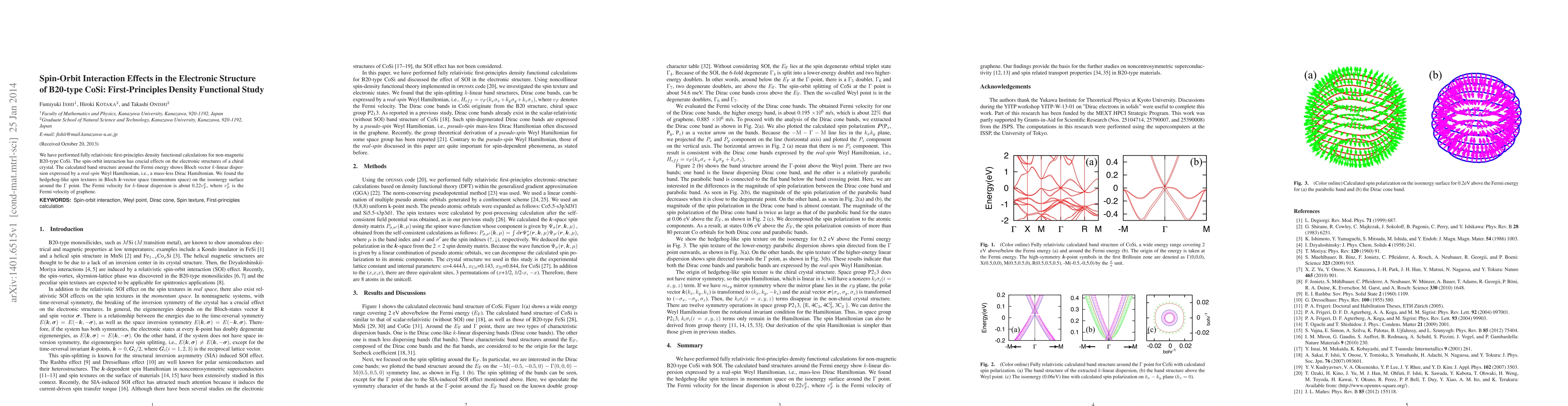This study uses relativistic density functional theory to investigate the electronic structure of B20-type CoSi, revealing significant spin-orbit interaction effects. The analysis uncovers a $real$-$spin$ Weyl Hamiltonian and a hedgehog-like spin texture in momentum space, indicating $k$-linear dispersion near the Fermi energy.