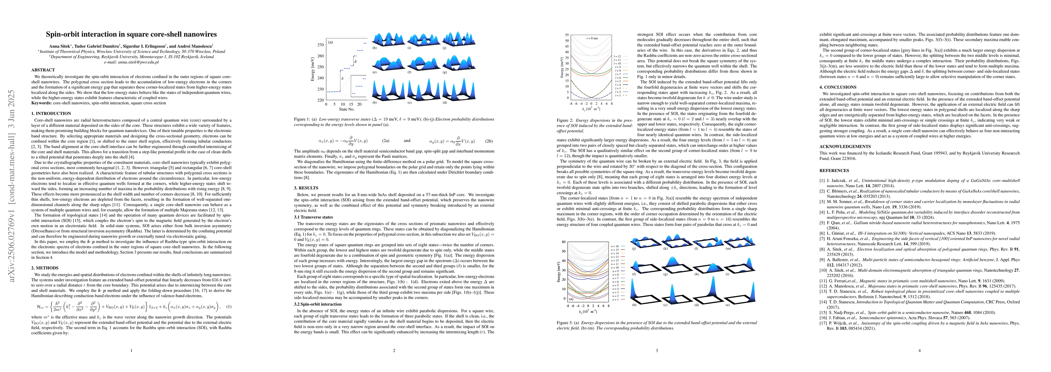 We theoretically investigate the spin-orbit interaction of electrons confined in the outer regions of square core-shell nanowires. The polygonal cross section leads to the accumulation of low-energy electrons in the corners and the formation of a significant energy gap that separates these corner-localized states from higher-energy states localized along the sides. We show that the low-energy states behave like the states of independent quantum wires, while the higher-energy states exhibit features characteristic of coupled wires.