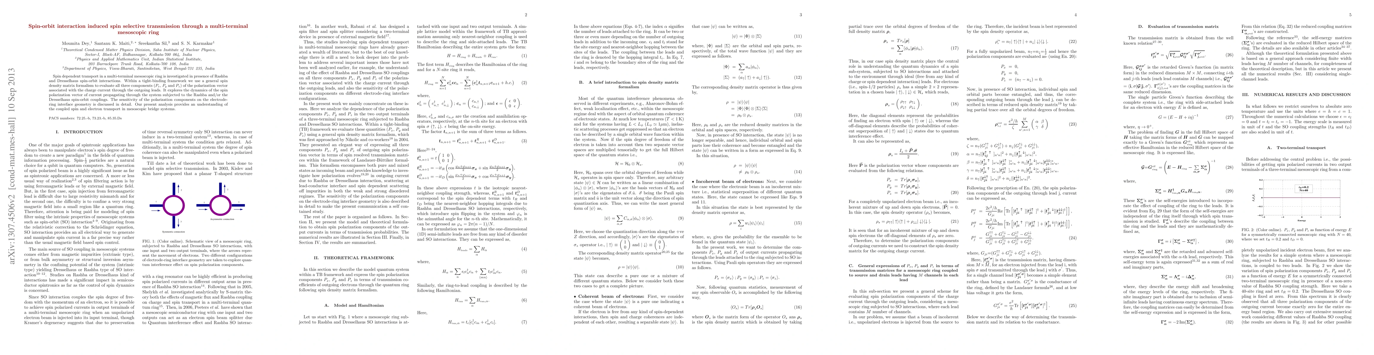 This paper investigates spin-dependent transport in a multi-terminal mesoscopic ring under Rashba and Dresselhaus spin-orbit interactions, using a tight-binding framework and spin density matrix formalism to analyze the polarization vector components of the charge current. It highlights the influence of interface geometry on spin-selective transmission and provides insights into coupled spin and electron transport in such systems.