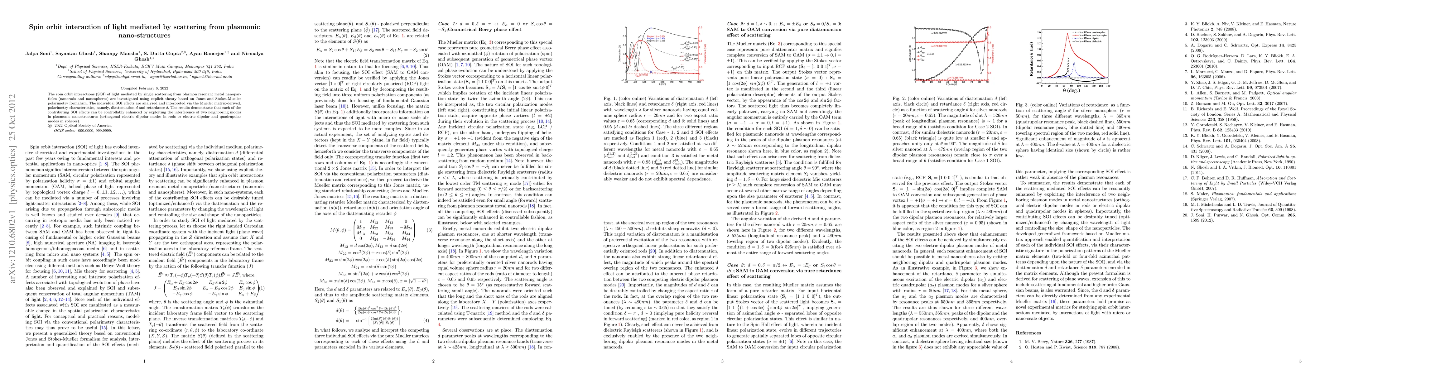 The spin orbit interactions (SOI) of light mediated by single scattering from plasmon resonant metal nanoparticles (nanorods and nanospheres) are investigated using explicit theory based on Jones and Stokes-Mueller polarimetry formalism. The individual SOI effects are analyzed and interpreted via the Mueller matrix-derived, polarimetry characteristics, namely, diattenuation d and retardance {\delta}. The results demonstrate that each of the contributing SOI effects can be controllably enhanced by exploiting the interference of two neighboring modes in plasmonic nanostructures (orthogonal electric dipolar modes in rods or electric dipolar and quadrupolar modes in spheres).
