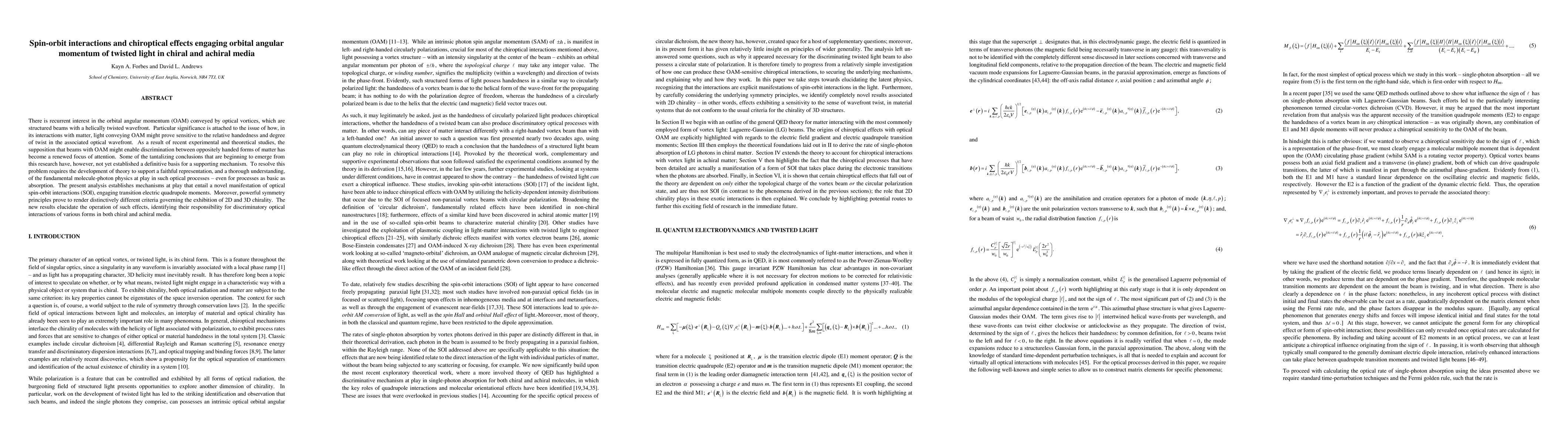 There is recurrent interest in the orbital angular momentum (OAM) conveyed by optical vortices, which are structured beams with a helically twisted wavefront. Particular significance is attached to the issue of how, in its interactions with matter, light conveying OAM might prove sensitive to the relative handedness and degree of twist in the associated optical wavefront. As a result of recent experimental and theoretical studies, the supposition that beams with OAM might enable discrimination between oppositely handed forms of matter has become a renewed focus of attention. Some of the tantalizing conclusions that are beginning to emerge from this research have, however, not yet established a definitive basis for a supporting mechanism. To resolve this problem requires the development of theory to support a faithful representation, and a thorough understanding, of the fundamental molecule-photon physics at play in such optical processes, even for processes as basic as absorption. The present analysis establishes mechanisms at play that entail a novel manifestation of optical spin-orbit interactions (SOI), engaging transition electric quadrupole moments. Moreover, powerful symmetry principles prove to render distinctively different criteria governing the exhibition of 2D and 3D chirality. The new results elucidate the operation of such effects, identifying their responsibility for discriminatory optical interactions of various forms in both chiral and achiral media.