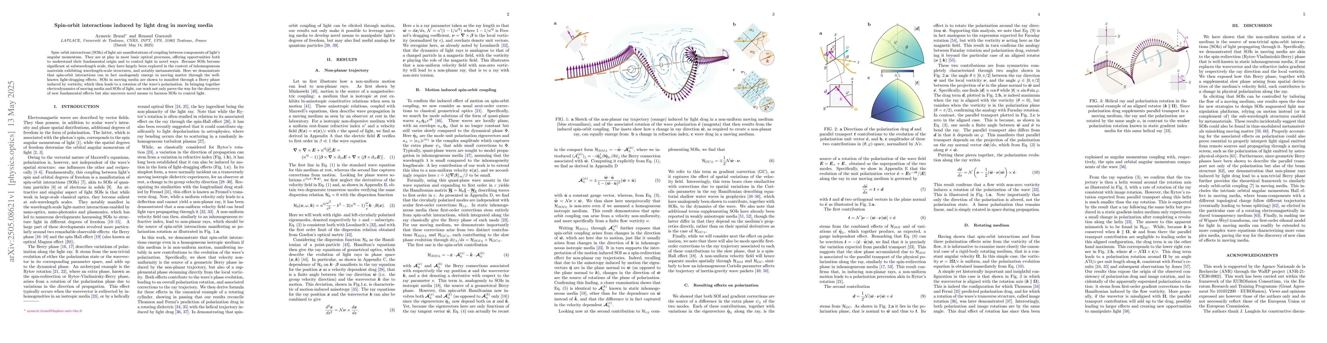 The paper demonstrates spin-orbit interactions (SOIs) in moving media via light-dragging effects, utilizing electrodynamics of moving media and SOIs of light.