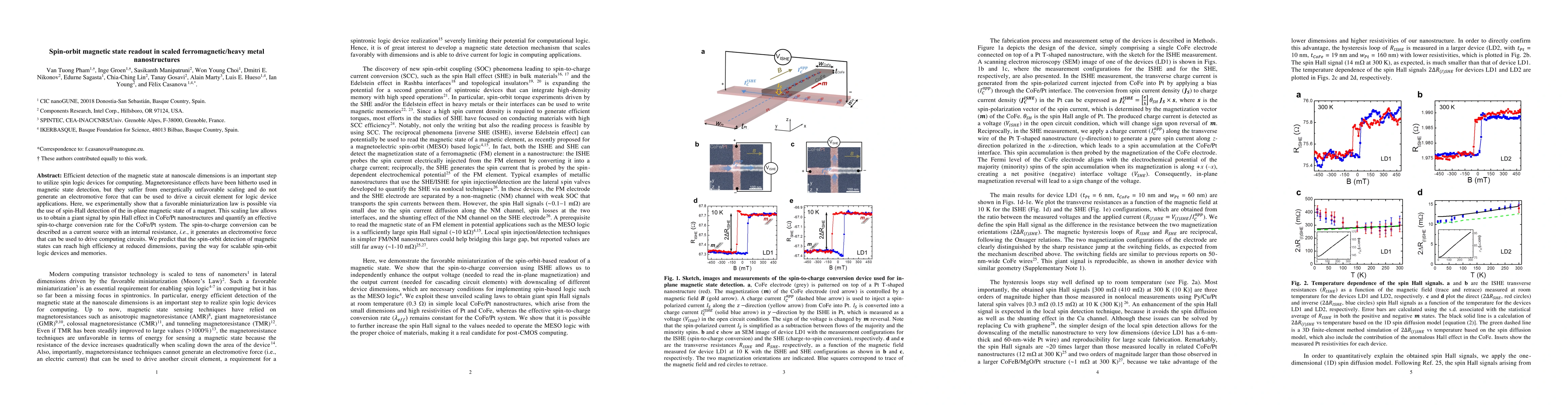 Efficient detection of the magnetic state at nanoscale dimensions is an important step to utilize spin logic devices for computing. Magnetoresistance effects have been hitherto used in magnetic state detection, but they suffer from energetically unfavorable scaling and do not generate an electromotive force that can be used to drive a circuit element for logic device applications. Here, we experimentally show that a favorable miniaturization law is possible via the use of spin-Hall detection of the in-plane magnetic state of a magnet. This scaling law allows us to obtain a giant signal by spin Hall effect in CoFe/Pt nanostructures and quantify an effective spin-to-charge conversion rate for the CoFe/Pt system. The spin-to-charge conversion can be described as a current source with an internal resistance, i.e., it generates an electromotive force that can be used to drive computing circuits. We predict that the spin-orbit detection of magnetic states can reach high efficiency at reduced dimensions, paving the way for scalable spin-orbit logic devices and memories.