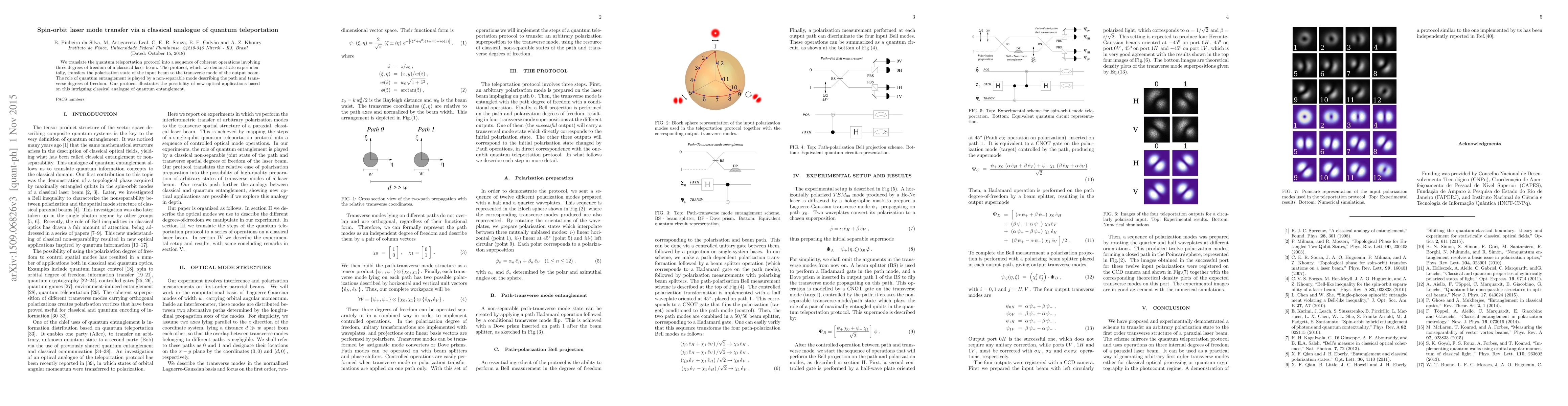 The paper presents a novel protocol for transferring polarisation states to transverse modes of laser beams using classical operations on three degrees of freedom, mimicking quantum teleportation.