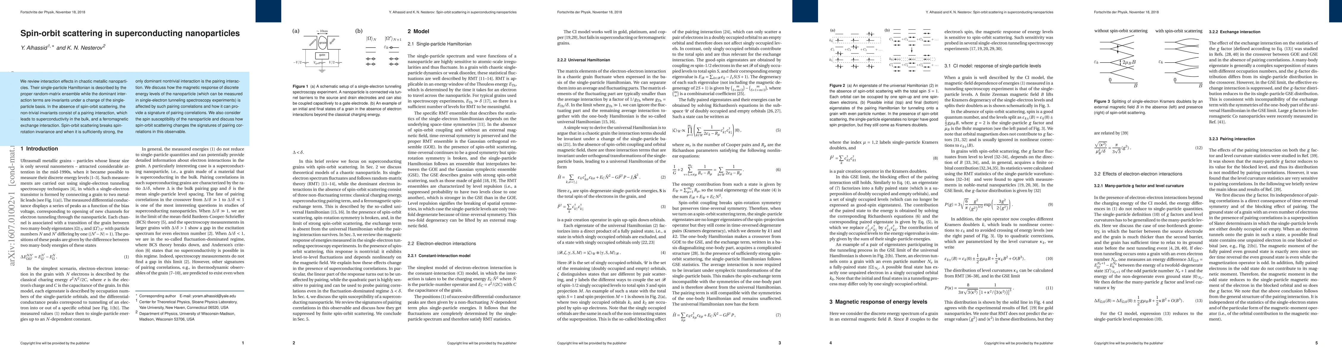 This paper reviews the effects of spin-orbit scattering in superconducting nanoparticles, showing that strong spin-orbit scattering breaks spin-rotation invariance and primarily preserves pairing interactions. It discusses how these interactions influence the magnetic response and spin susceptibility, providing signatures detectable via single-electron tunneling spectroscopy.