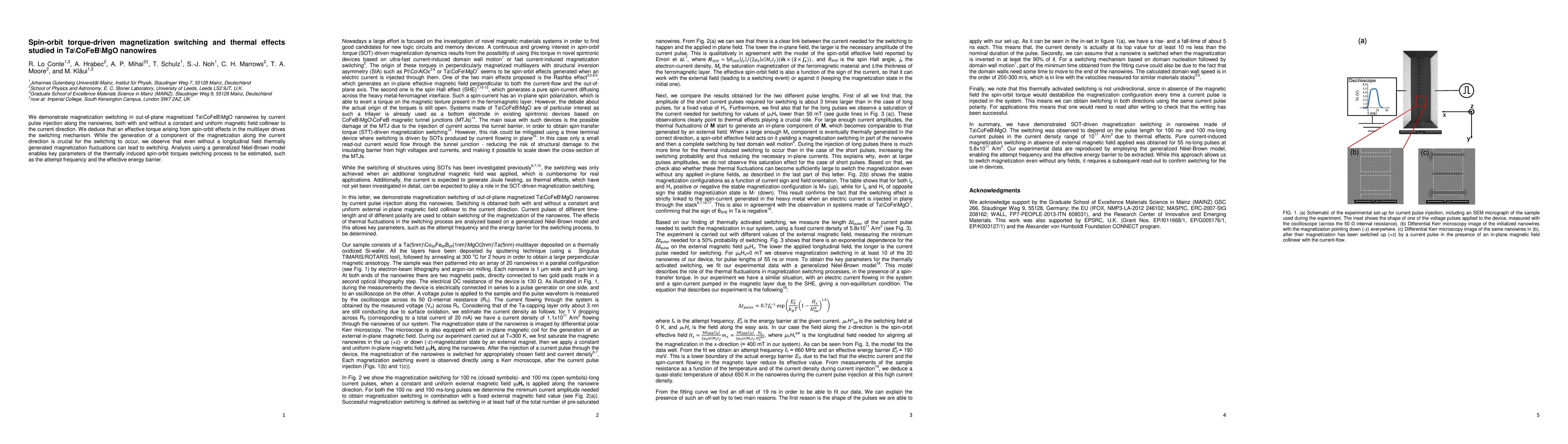This research demonstrates magnetization switching in Ta/CoFeB/MgO nanowires via spin-orbit torque from current pulses, with or without an applied magnetic field. It finds that thermal fluctuations can also enable switching, and uses a generalized Néel-Brown model to estimate parameters of the thermally induced switching process.