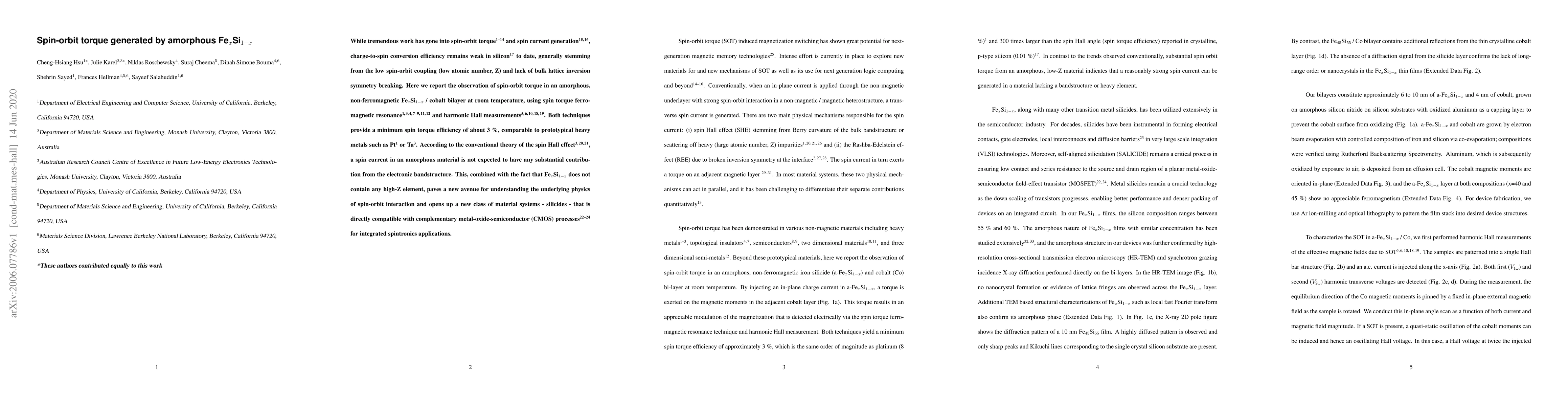While tremendous work has gone into spin-orbit torque and spin current generation, charge-to-spin conversion efficiency remains weak in silicon to date, generally stemming from the low spin-orbit coupling (low atomic number, Z) and lack of bulk lattice inversion symmetry breaking. Here we report the observation of spin-orbit torque in an amorphous, non-ferromagnetic Fe$_{x}$Si$_{1-x}$ / cobalt bilayer at room temperature, using spin torque ferromagnetic resonance and harmonic Hall measurements. Both techniques provide a minimum spin torque efficiency of about 3 %, comparable to prototypical heavy metals such as Pt or Ta. According to the conventional theory of the spin Hall effect, a spin current in an amorphous material is not expected to have any substantial contribution from the electronic bandstructure. This, combined with the fact that Fe$_{x}$Si$_{1-x}$ does not contain any high-Z element, paves a new avenue for understanding the underlying physics of spin-orbit interaction and opens up a new class of material systems - silicides - that is directly compatible with complementary metal-oxide-semiconductor (CMOS) processes for integrated spintronics applications.