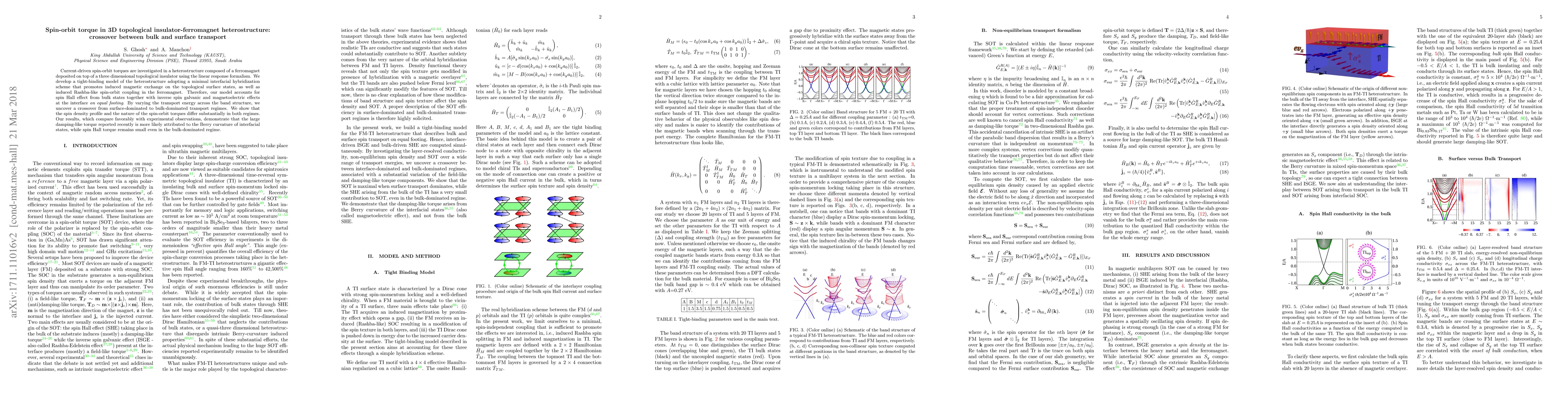 This paper investigates spin-orbit torques in a 3D topological insulator-ferromagnet heterostructure, showing a crossover from surface-dominated to bulk-dominated transport regimes. It demonstrates that the interfacial magnetoelectric effect contributes significantly to the damping torque, while spin Hall torque remains minor.
