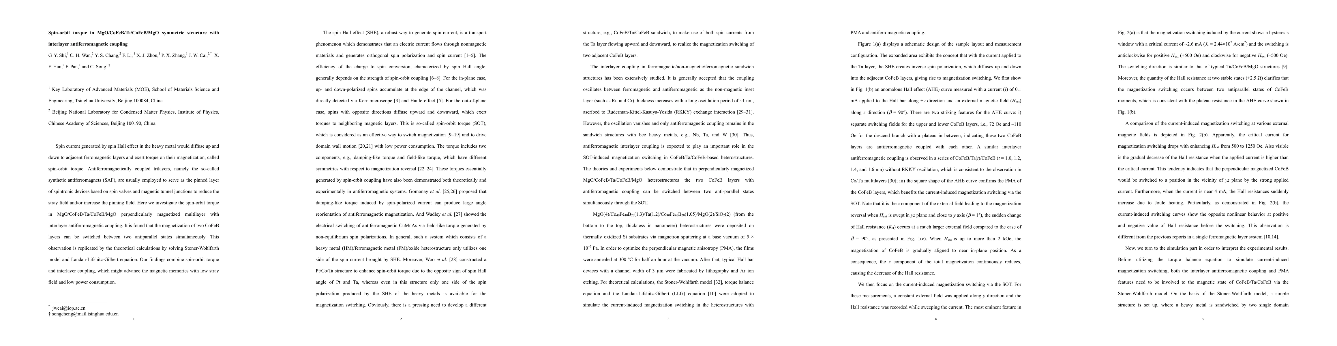 This research investigates spin-orbit torque in a MgO/CoFeB/Ta/CoFeB/MgO multilayer with interlayer antiferromagnetic coupling, finding that the magnetization of two CoFeB layers can switch simultaneously. Theoretical calculations corroborate these results, suggesting potential advancements in low-power magnetic memory technologies.
