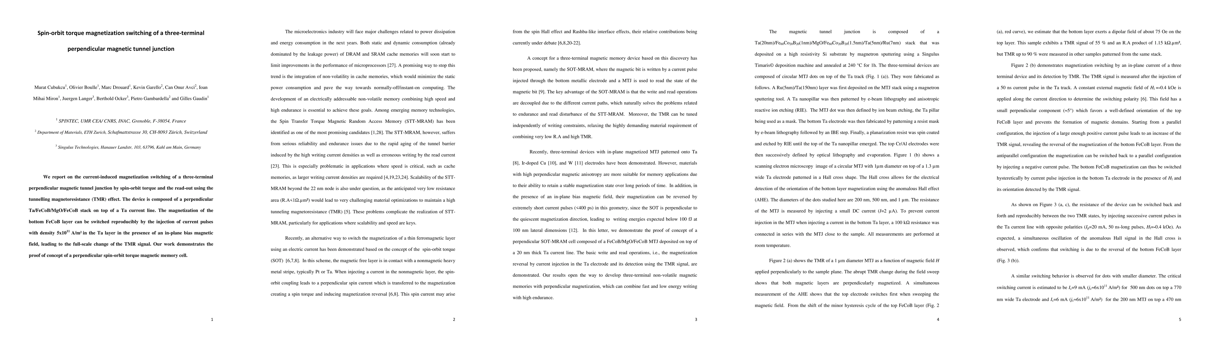This paper demonstrates the successful magnetization switching of a three-terminal perpendicular magnetic tunnel junction using spin-orbit torque, with current pulses achieving reproducible switching in the presence of an in-plane magnetic field, verified by the tunneling magnetoresistance effect. The concept establishes a potential pathway for spin-orbit torque magnetic memory cells.