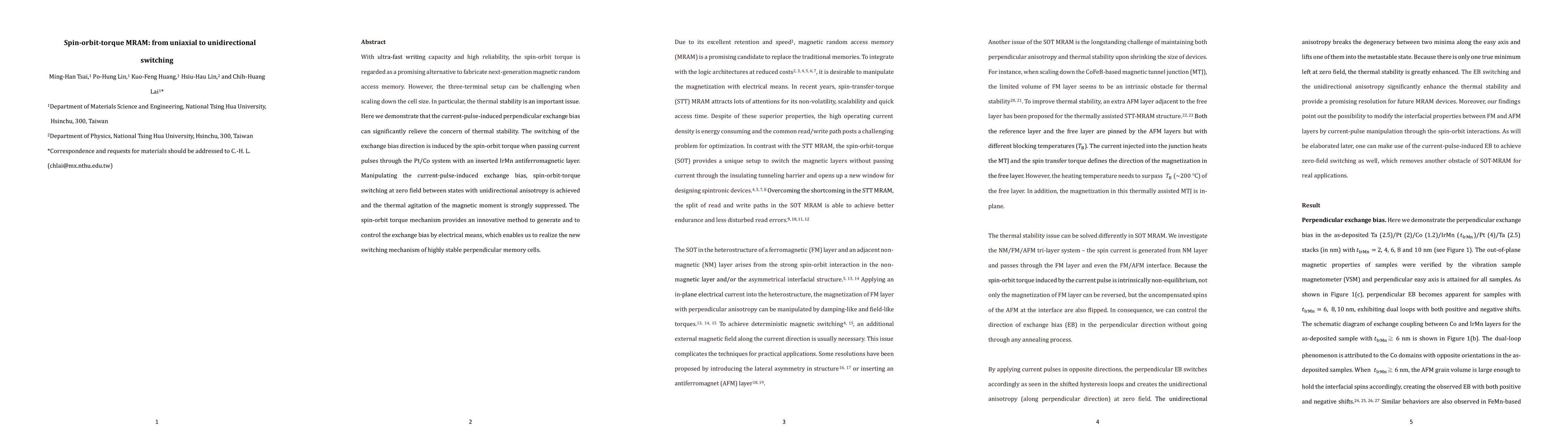 This paper demonstrates a spin-orbit torque mechanism that enables efficient and thermally stable switching in magnetic random access memory (MRAM) cells, utilizing current pulses to induce a unidirectional exchange bias directionality and suppress thermal agitation, thus paving the way for next-generation memory technology.