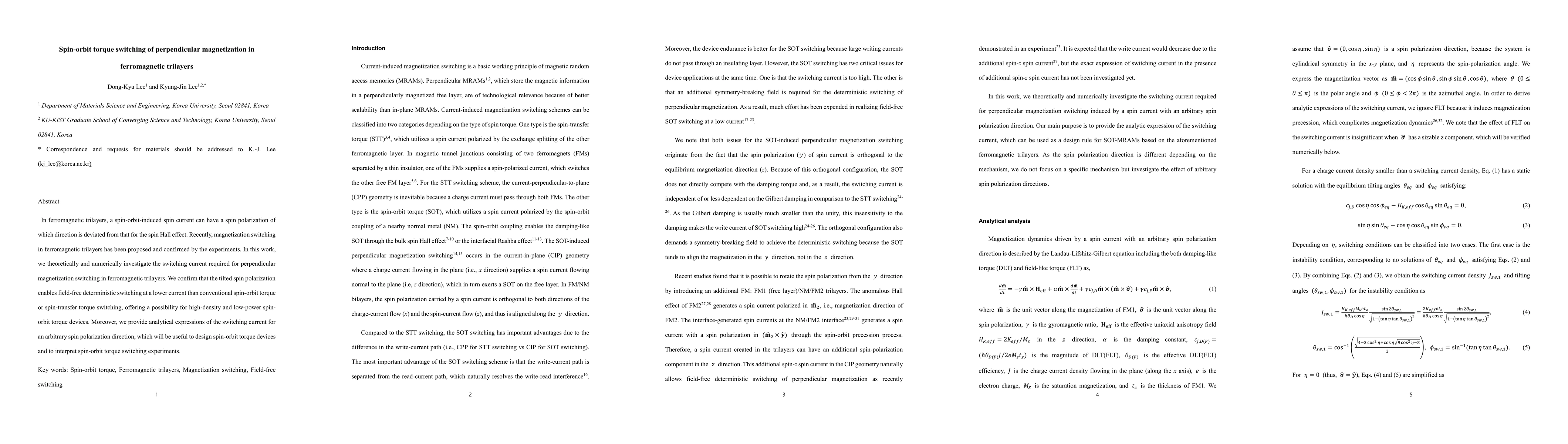 This research investigates the spin-orbit torque-induced switching of perpendicular magnetization in ferromagnetic trilayers, finding that tilted spin polarization enables lower current field-free switching compared to conventional methods, offering potential for low-power devices. Analytical expressions for switching current are provided for various spin polarization directions, aiding in device design and experiment interpretation.