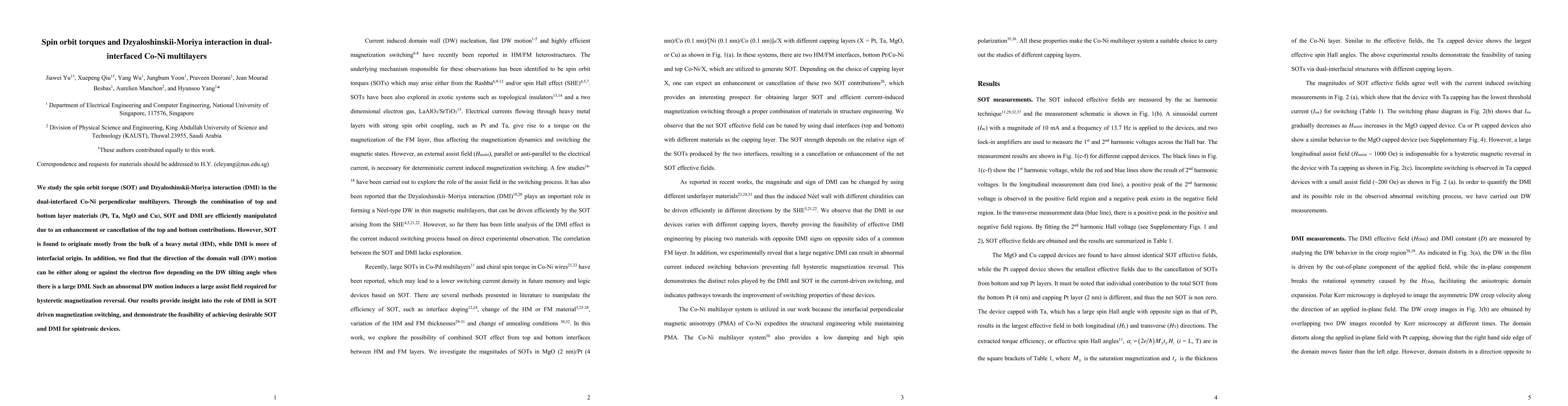 This paper investigates spin orbit torque (SOT) and Dzyaloshinskii-Moriya interaction (DMI) in Co-Ni multilayers with various dual interfaces. It finds that SOT mainly originates from the bulk of heavy metals, while DMI is interfacial, and demonstrates that domain wall motion can be manipulated by DMI, impacting magnetization reversal.