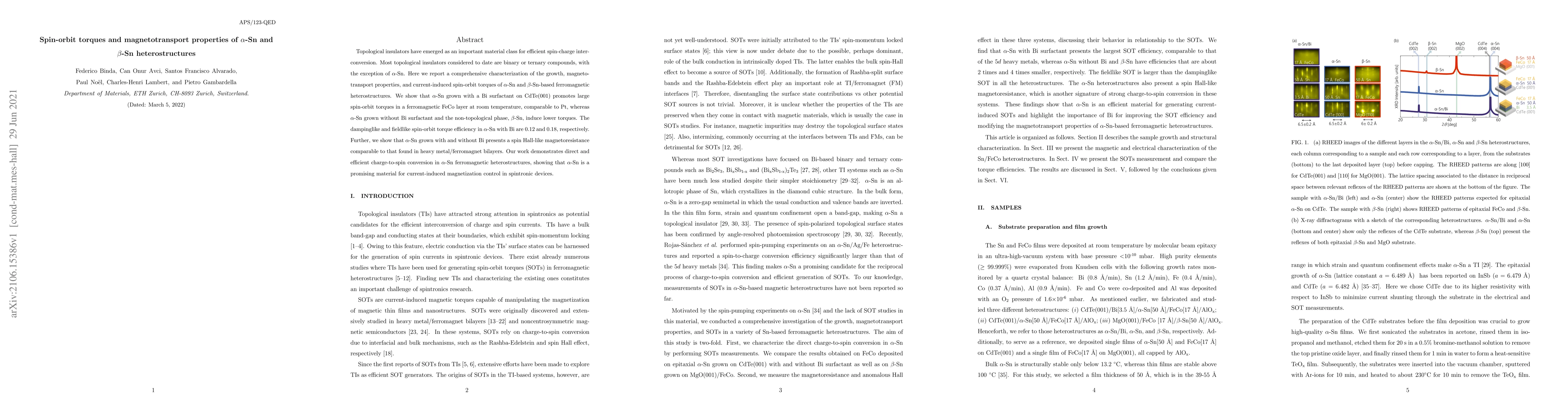 This paper investigates the spin-orbit torques and magnetotransport properties of $\alpha$-Sn and $\beta$-Sn heterostructures, finding that $\alpha$-Sn with a Bi surfactant promotes large spin-orbit torques in a ferromagnetic FeCo layer, comparable to Pt, while $\beta$-Sn induces lower torques, indicating $\alpha$-Sn's potential for efficient spintronic applications.