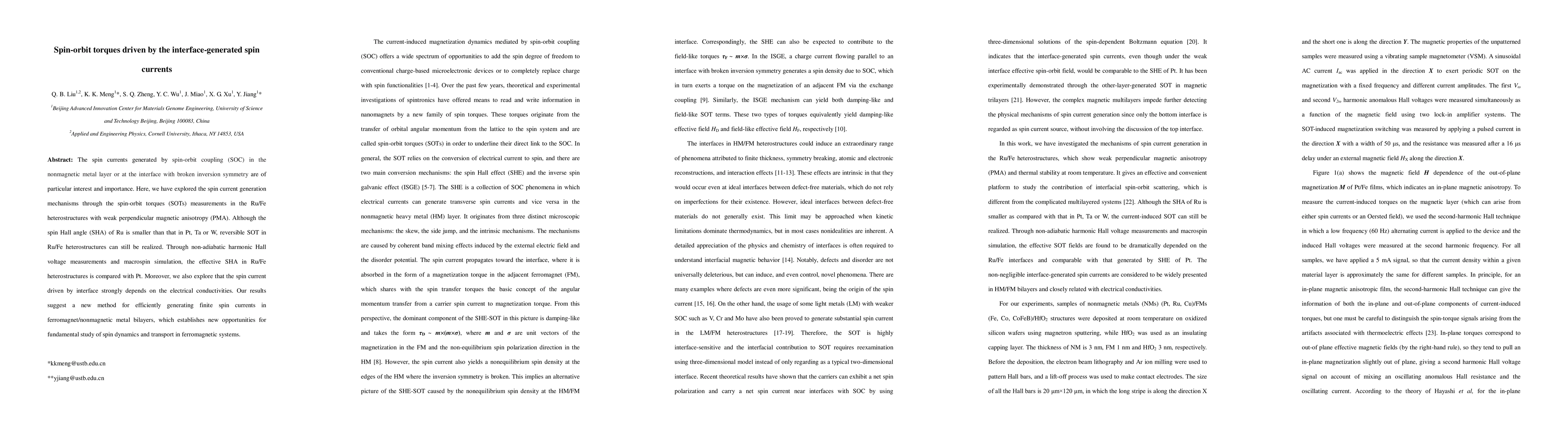 This paper investigates spin current generation via spin-orbit torques in Ru/Fe heterostructures, demonstrating the effectiveness of such mechanisms despite Ru's lower spin Hall angle compared to Pt, Ta, or W. The study highlights the dependence of interface-generated spin currents on electrical conductivity, proposing a new method for efficient spin current generation in ferromagnetic/nonmagnetic metal bilayers.