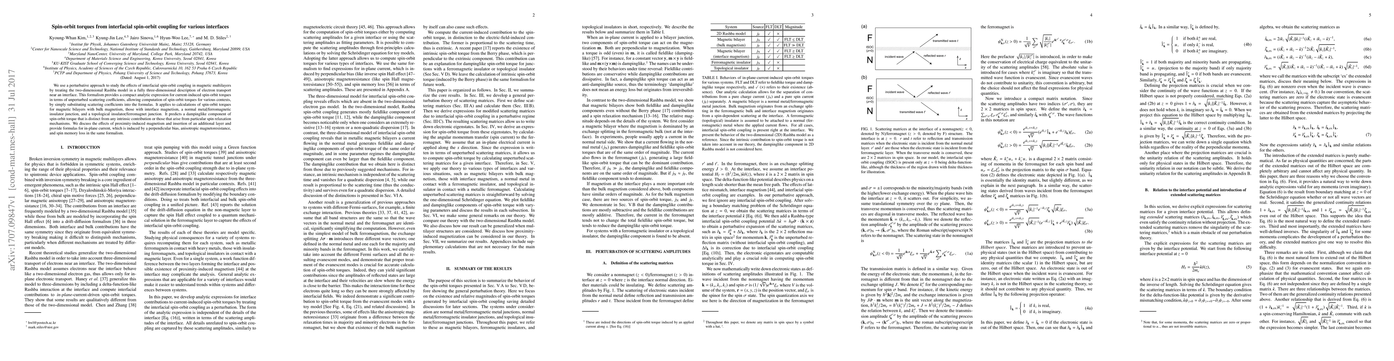 We use a perturbative approach to study the effects of interfacial spin-orbit coupling in magnetic multilayers by treating the two-dimensional Rashba model in a fully three-dimensional description of electron transport near an interface. This formalism provides a compact analytic expression for current-induced spin-orbit torques in terms of unperturbed scattering coefficients, allowing computation of spin-orbit torques for various contexts, by simply substituting scattering coefficients into the formulas. It applies to calculations of spin-orbit torques for magnetic bilayers with bulk magnetism, those with interface magnetism, a normal metal/ferromagnetic insulator junction, and a topological insulator/ferromagnet junction. It predicts a dampinglike component of spin-orbit torque that is distinct from any intrinsic contribution or those that arise from particular spin relaxation mechanisms. We discuss the effects of proximity-induced magnetism and insertion of an additional layer and provide formulas for in-plane current, which is induced by a perpendicular bias, anisotropic magnetoresistance, and spin memory loss in the same formalism.