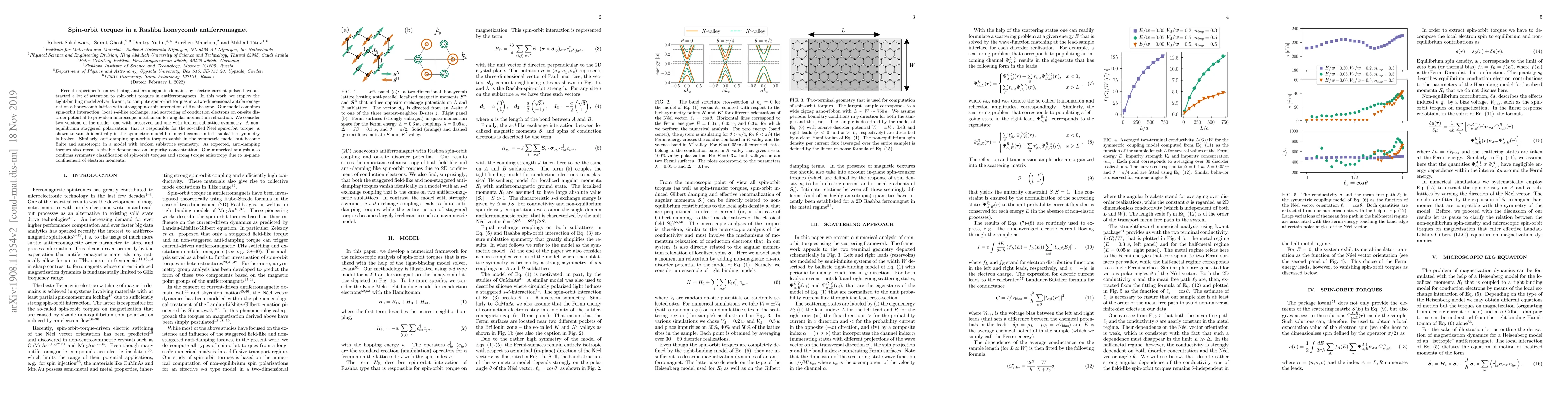 Recent experiments on switching antiferromagnetic domains by electric current pulses have attracted a lot of attention to spin-orbit torques in antiferromagnets. In this work, we employ the tight-binding model solver, kwant, to compute spin-orbit torques in a two-dimensional antiferromagnet on a honeycomb lattice with strong spin-orbit interaction of Rashba type. Our model combines spin-orbit interaction, local s-d-like exchange, and scattering of conduction electrons on on-site disorder potential to provide a microscopic mechanism for angular momentum relaxation. We consider two versions of the model: one with preserved and one with broken sublattice symmetry. A non-equilibrium staggered polarization, that is responsible for the so-called Neel spin-orbit torque, is shown to vanish identically in the symmetric model but may become finite if sublattice symmetry is broken. Similarly, anti-damping spin-orbit torques vanish in the symmetric model but become finite and anisotropic in a model with broken sublattice symmetry. As expected, anti-damping torques also reveal a sizable dependence on impurity concentration. Our numerical analysis also confirms symmetry classification of spin-orbit torques and strong torque anisotropy due to in-plane confinement of electron momenta.