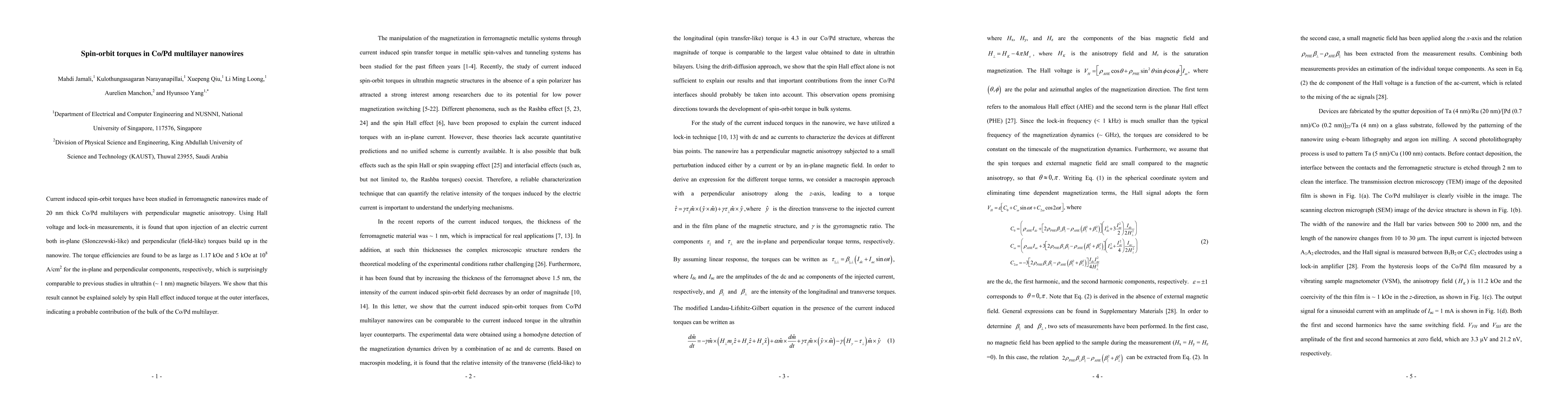 This research investigates spin-orbit torques in 20 nm thick Co/Pd multilayer nanowires, revealing significant in-plane and perpendicular torques comparable to those in ultrathin magnetic bilayers. The study finds that the torque efficiencies are as high as 1.17 kOe and 5 kOe, indicating contributions from both the interfaces and the bulk of the multilayer.