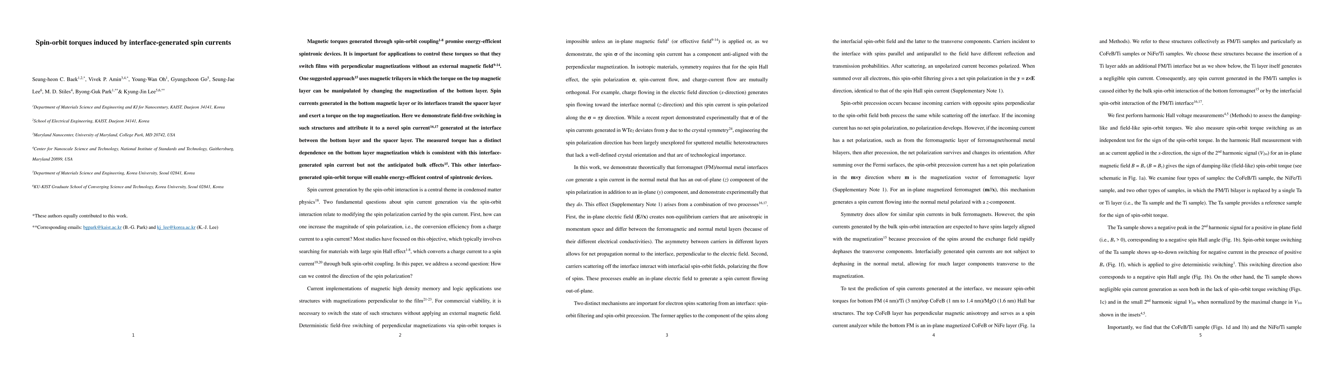 This paper demonstrates field-free switching in magnetic trilayer structures via a novel spin current generated at the interface between the bottom layer and the spacer layer, enabling energy-efficient control of spintronic devices without an external magnetic field. The observed spin-orbit torque depends on the bottom layer's magnetization, indicating the role of interface-generated spin currents rather than bulk effects.