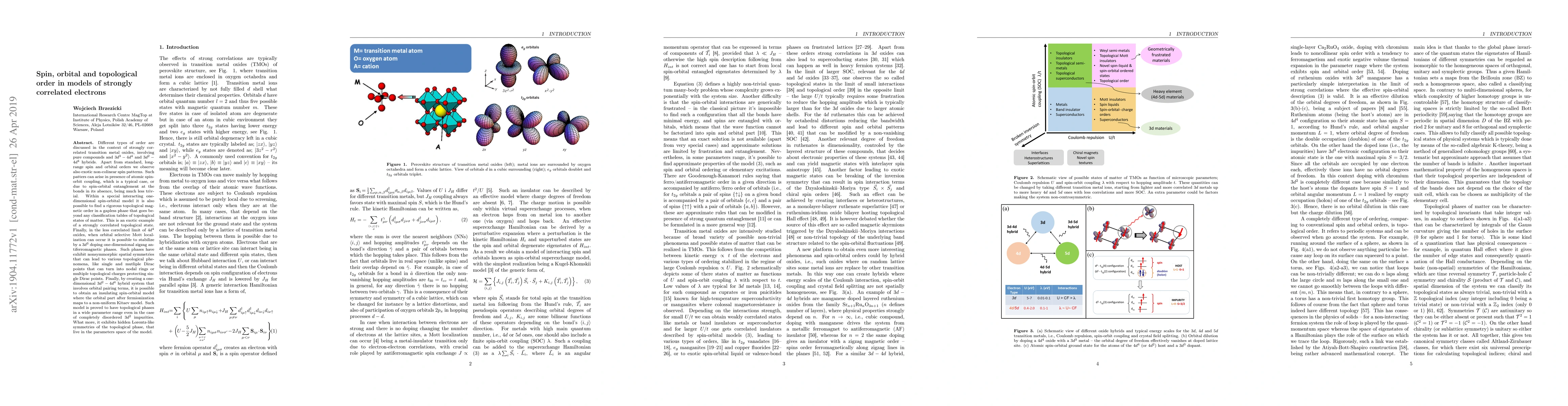 Different types of order are discussed in the context of strongly correlated transition metal oxides, involving pure compounds and $3d^{3}-4d^{4}$ and $3d^{2}-4d^{4}$ hybrids. Apart from standard, long-range spin and orbital orders we observe also exotic non-colinear spin patterns. Such patters can arise in presence of atomic spin-orbit coupling, which is a typical case, or due to spin-orbital entanglement at the bonds in its absence, being much less trivial. Within a special interacting one-dimensional spin-orbital model it is also possible to find a rigorous topological magnetic order in a gapless phase that goes beyond any classification tables of topological states of matter. This is an exotic example of a strongly correlated topological state. Finally, in the less correlated limit of $4d^{4}$ oxides, when orbital selective Mott localization can occur it is possible to stabilize by a $3d^{3}$ doping one-dimensional zigzag antiferromagnetic phases. Such phases have exhibit nonsymmorphic spatial symmetries that can lead to various topological phenomena, like single and mutliple Dirac points that can turn into nodal rings or multiple topological charges protecting single Dirac points. Finally, by creating a one-dimensional $3d^{2}-4d^{4}$ hybrid system that involves orbital pairing terms, it is possible to obtain an insulating spin-orbital model where the orbital part after fermionization maps to a non-uniform Kitaev model. Such model is proved to have topological phases in a wide parameter range even in the case of completely disordered $3d^{2}$ impurities. What more, it exhibits hidden Lorentz-like symmetries of the topological phase, that live in the parameters space of the model.