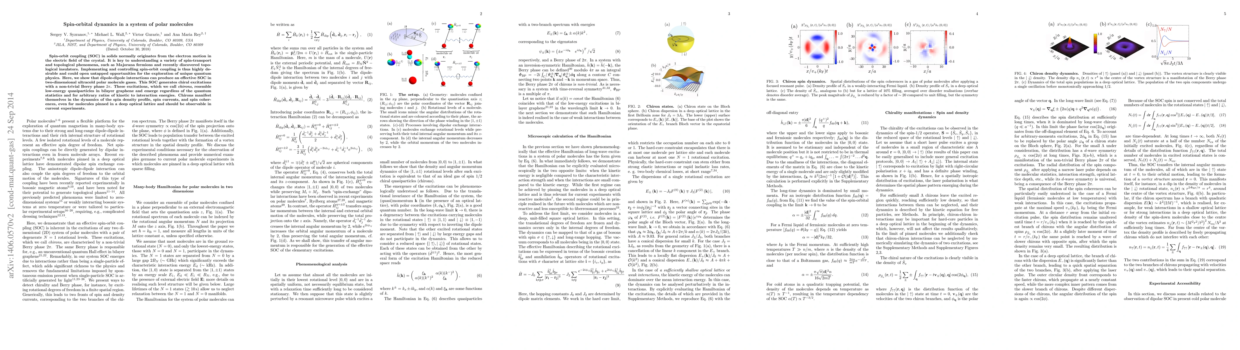 Spin-orbit coupling (SOC) in solids normally originates from the electron motion in the electric field of the crystal. It is key to understanding a variety of spin-transport and topological phenomena, such as Majorana fermions and recently discovered topological insulators. Implementing and controlling spin-orbit coupling is thus highly desirable and could open untapped opportunities for the exploration of unique quantum physics. Here, we show that dipole-dipole interactions can produce an effective SOC in two-dimensional ultracold polar molecule gases. This SOC generates chiral excitations with a non-trivial Berry phase $2\pi$. These excitations, which we call \emph{chirons}, resemble low-energy quasiparticles in bilayer graphene and emerge regardless of the quantum statistics and for arbitrary ratios of kinetic to interaction energies. Chirons manifest themselves in the dynamics of the spin density profile, spin currents, and spin coherences, even for molecules pinned in a deep optical lattice and should be observable in current experiments.