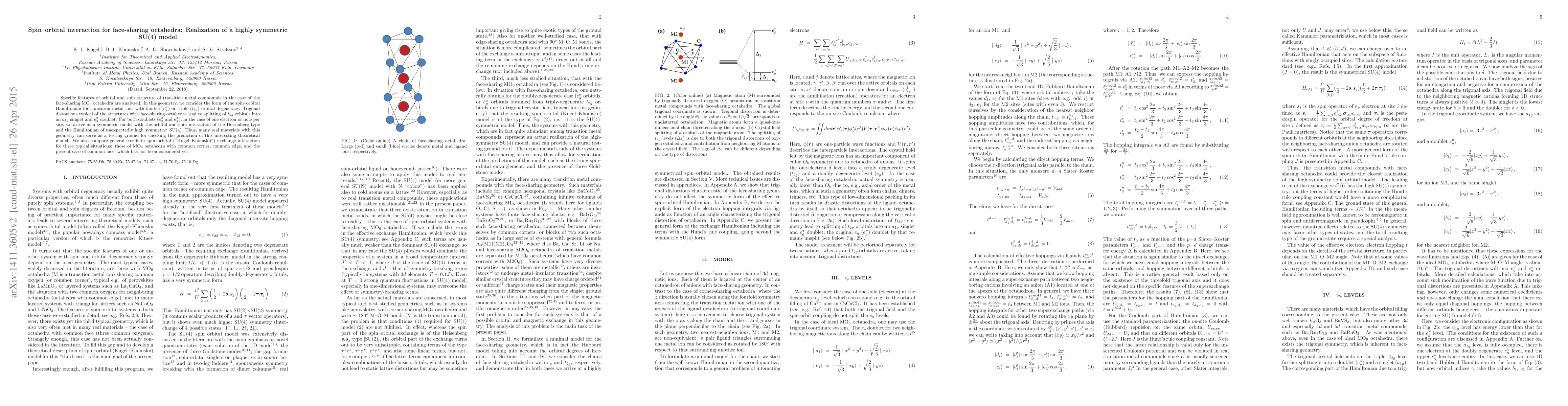 This paper analyzes the spin-orbital interaction in face-sharing octahedra, revealing a highly symmetric SU(4) model for transition metal compounds. It compares spin-orbital interactions in different octahedral geometries, highlighting the unique features of face-sharing configurations.