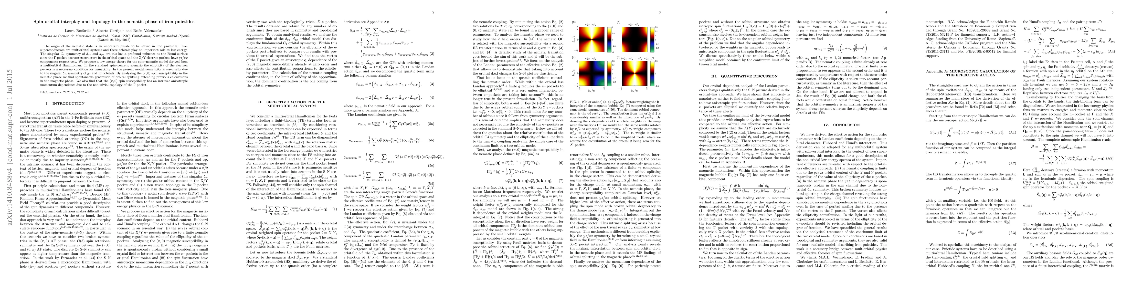This paper explores the nematic phase in iron pnictides, proposing a low-energy theory where nematicity arises from the singular $C_4$ symmetry of $d_{zx}$ and $d_{yz}$ orbitals, leading to spontaneous orbital splitting and an anisotropic momentum dependence in spin susceptibility due to the non-trivial topology of the Fermi surface.