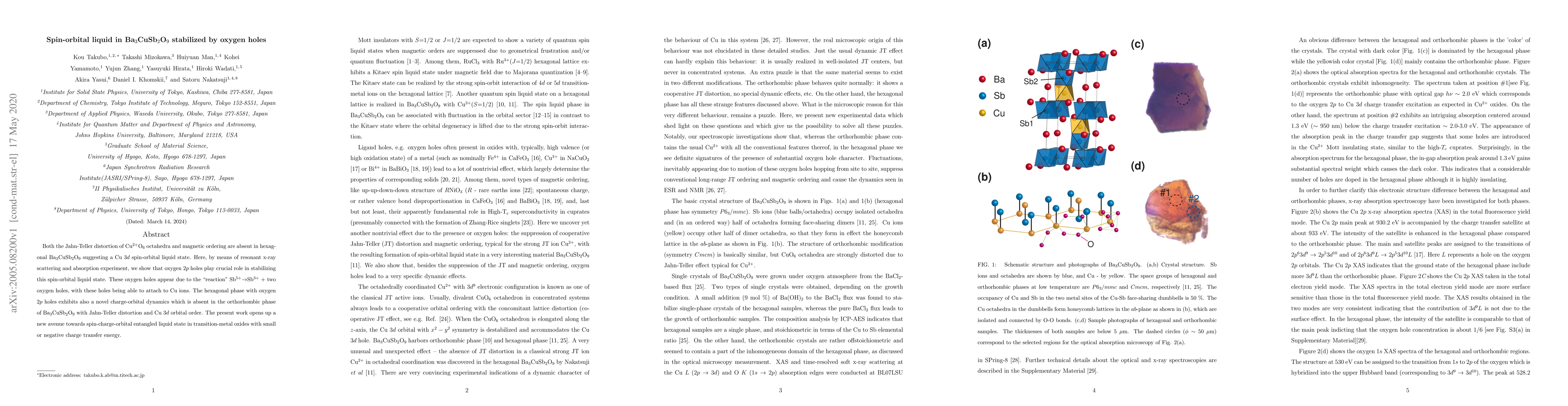 Both the Jahn-Teller distortion of Cu$^{2+}$O$_6$ octahedra and magnetic ordering are absent in hexagonal Ba$_3$CuSb$_2$O$_9$ suggesting a Cu 3$d$ spin-orbital liquid state. Here, by means of resonant x-ray scattering and absorption experiment, we show that oxygen 2$p$ holes play crucial role in stabilizing this spin-orbital liquid state. These oxygen holes appear due to the "reaction" Sb$^{5+}$$\rightarrow$Sb$^{3+}$ $+$ two oxygen holes, with these holes being able to attach to Cu ions. The hexagonal phase with oxygen 2$p$ holes exhibits also a novel charge-orbital dynamics which is absent in the orthorhombic phase of Ba$_3$CuSb$_2$O$_9$ with Jahn-Teller distortion and Cu 3$d$ orbital order. The present work opens up a new avenue towards spin-charge-orbital entangled liquid state in transition-metal oxides with small or negative charge transfer energy.