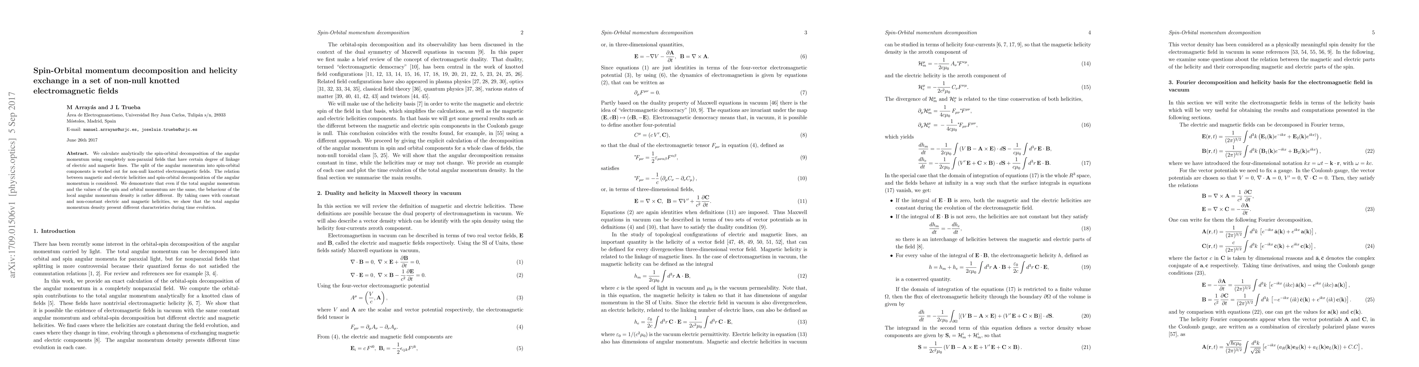 We calculate analytically the spin-orbital decomposition of the angular momentum using completely non-paraxial fields that have certain degree of linkage of electric and magnetic lines. The split of the angular momentum into spin-orbital components is worked out for non-null knotted electromagnetic fields. The relation between magnetic and electric helicities and spin-orbital decomposition of the angular momentum is considered. We demonstrate that even if the total angular momentum and the values of the spin and orbital momentum are the same, the behaviour of the local angular momentum density is rather different. By taking cases with constant and non-constant electric and magnetic helicities, we show that the total angular momentum density present different characteristics during time evolution.