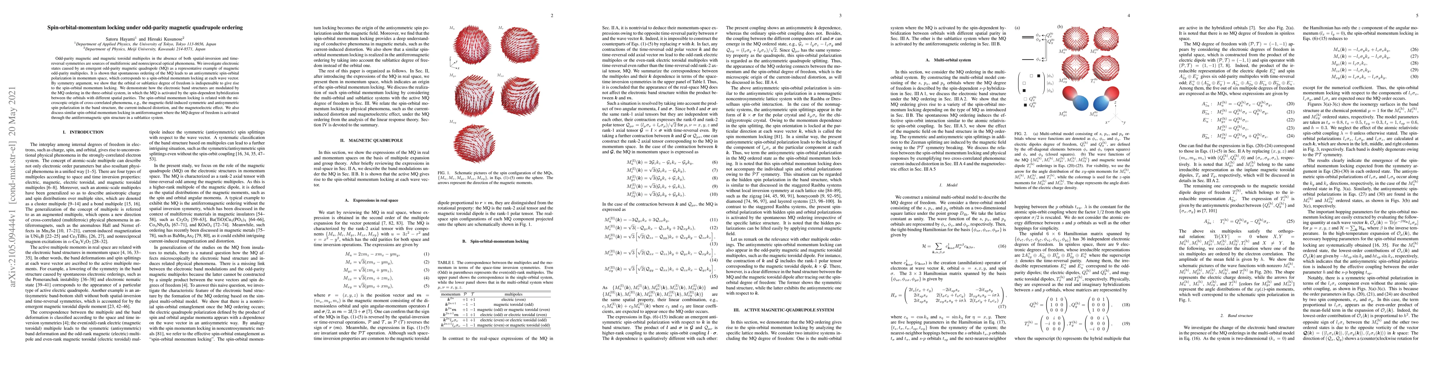 This paper investigates the spin-orbital-momentum locking resulting from an odd-parity magnetic quadrupole ordering, demonstrating its role in generating antisymmetric spin-orbital polarization and modulating electronic band structures. The study highlights the necessity of orbital degrees of freedom in this phenomenon and its implications for cross-correlated phenomena like magnetoelectric effects.