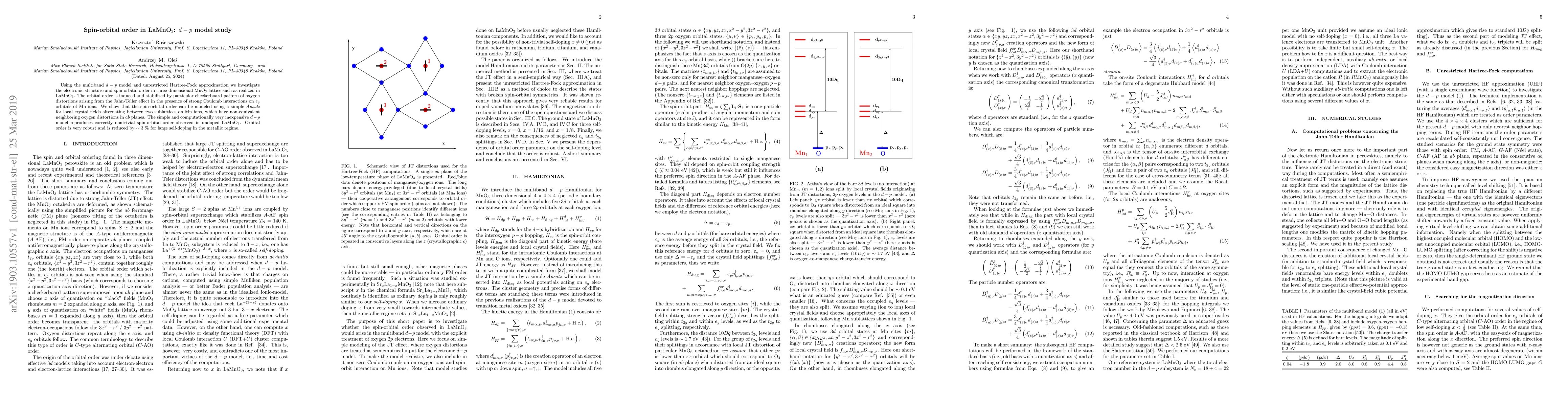 Using the multiband $d-p$ model and unrestricted Hartree-Fock approximation we investigate the electronic structure and spin-orbital order in three-dimensional MnO$_3$ lattice such as realized in LaMnO$_3$. The orbital order is induced and stabilized by particular checkerboard pattern of oxygen distortions arising from the Jahn-Teller effect in the presence of strong Coulomb interactions on $e_g$ orbitals of Mn ions. We show that the spin-orbital order can be modeled using a simple \textit{Ansatz} for local crystal fields alternating between two sublattices on Mn ions, which have non-equivalent neighboring oxygen distortions in $ab$ planes. The simple and computationally very inexpensive $d-p$ model reproduces correctly nontrivial spin-orbital order observed in undoped LaMnO$_3$. Orbital order is very robust and is reduced by $\sim 3$ \% for large self-doping in the metallic regime.