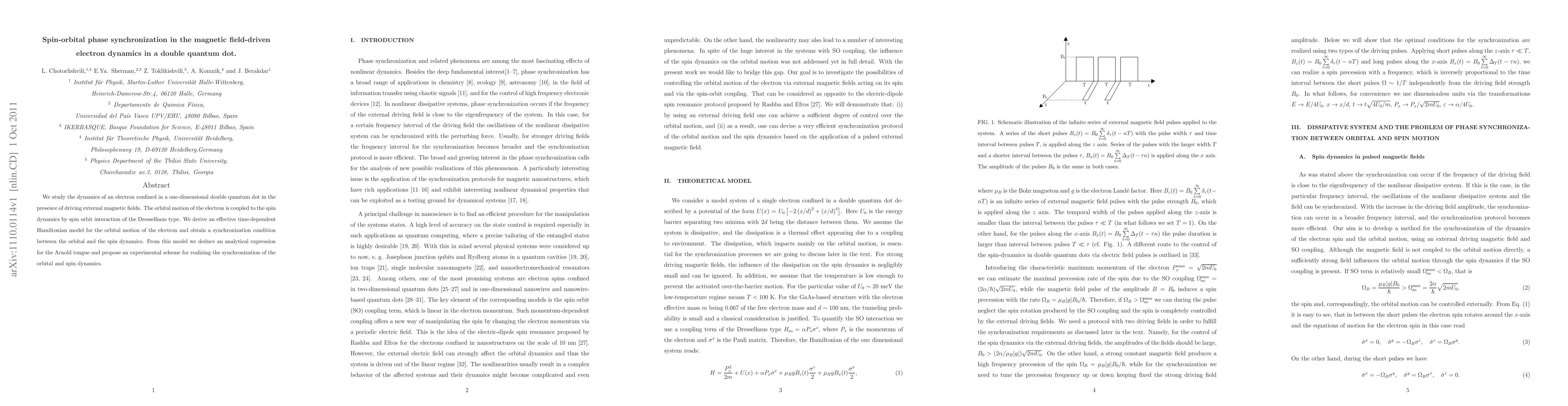 Researchers studied electron dynamics in a double quantum dot under external magnetic fields, finding synchronization between orbital motion and spin dynamics through a specific interaction.