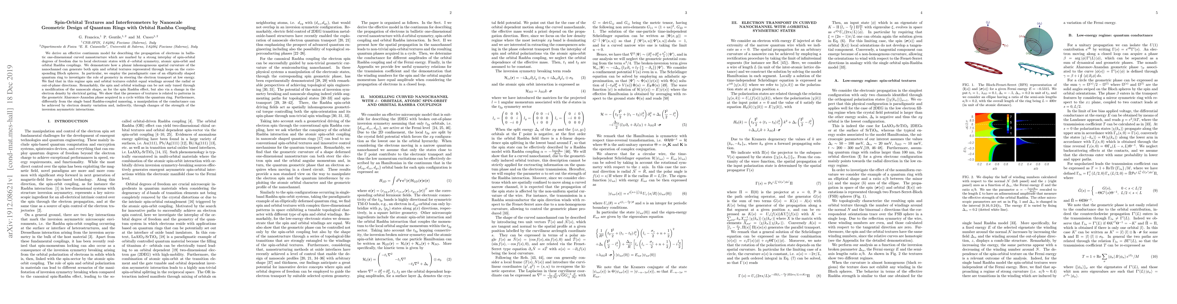 We derive an effective continuum model for describing the propagation of electrons in ballistic one-dimensional curved nanostructure which are marked by a strong interplay of spin-orbital degrees of freedom due to local electronic states with $d-$orbital symmetry, atomic spin-orbit and orbital Rashba couplings. We demonstrate how a planar inhomogeneous spatial curvature of the nanochannel can generate both spin and orbital textures represented through loops on the corresponding Bloch spheres. In particular, we employ the paradigmatic case of an elliptically shaped quantum ring to investigate the role of geometry in steering the electron transport at low energy. We find that in this regime spin and orbital textures exhibit equal windings around the radial or out-of-plane directions. Remarkably, the spin and orbital windings can be not only tuned through a modification of the nanoscale shape, as for the spin Rashba effect, but also via a change in the electron density by electrical gating. We show that the presence of textures is related to patterns in the geometric Aharonov-Anandan phase acquired in a cycle within the quantum ring. Furthermore, differently from the single band Rashba-coupled nanoring, a manipulation of the conductance can be achieved by electron density variation and, indirectly, through changes of the strength of the inversion asymmetric interactions.