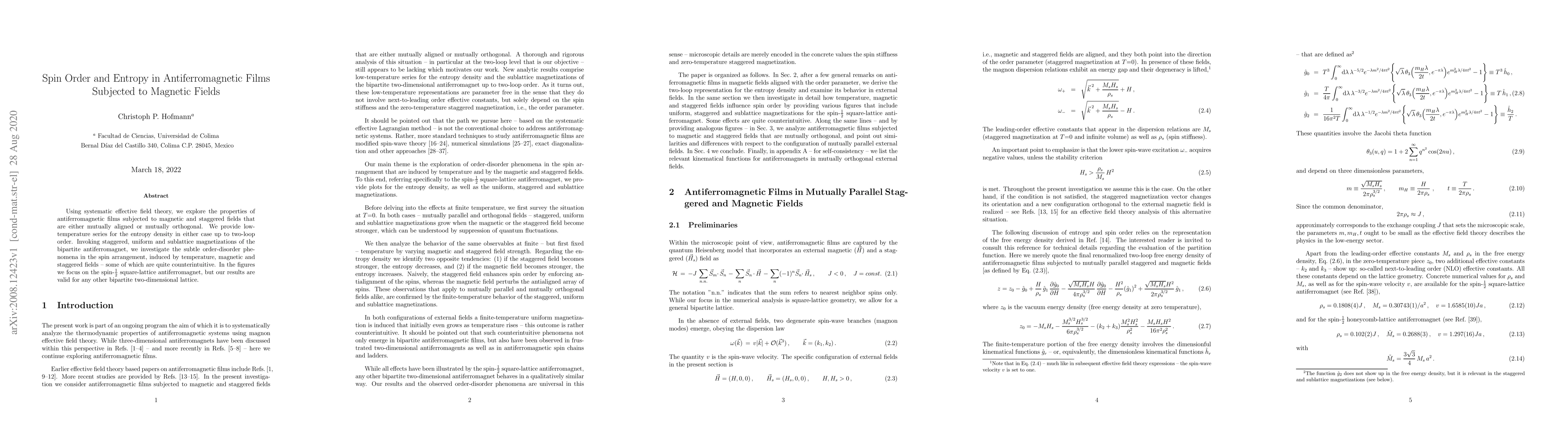 Using systematic effective field theory, we explore the properties of antiferromagnetic films subjected to magnetic and staggered fields that are either mutually aligned or mutually orthogonal. We provide low-temperature series for the entropy density in either case up to two-loop order. Invoking staggered, uniform and sublattice magnetizations of the bipartite antiferromagnet, we investigate the subtle order-disorder phenomena in the spin arrangement, induced by temperature, magnetic and staggered fields -- some of which are quite counterintuitive. In the figures we focus on the spin-$\frac{1}{2}$ square-lattice antiferromagnet, but our results are valid for any other bipartite two-dimensional lattice.
