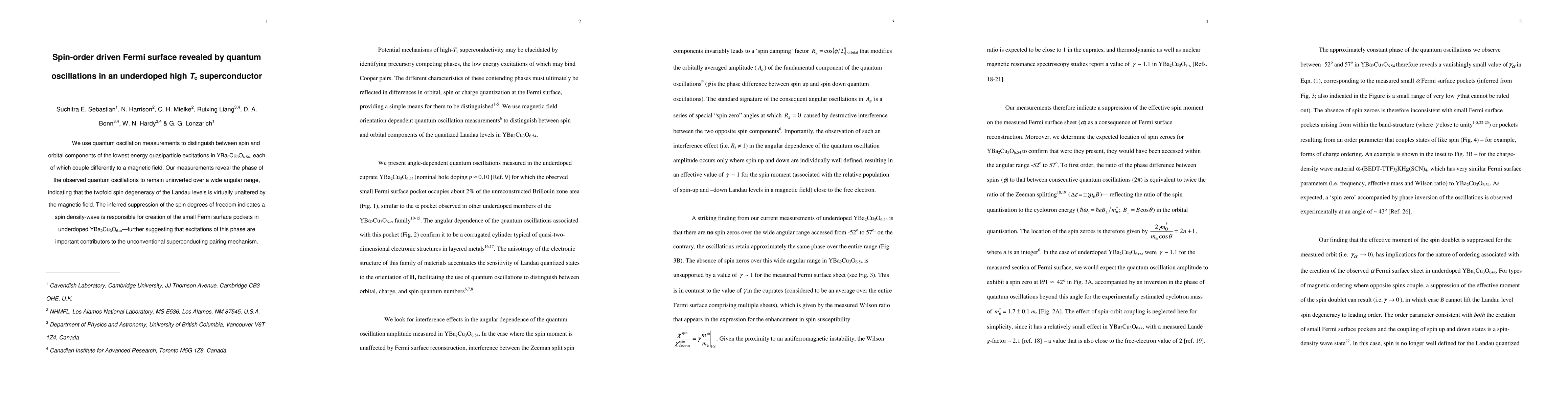 This study reveals that spin-order, rather than orbital effects, drives the formation of small Fermi surface pockets in underdoped YBa2Cu3O6.54, as evidenced by unchanged phase of quantum oscillations under magnetic fields, suggesting a spin density wave and its role in the unconventional superconductivity.