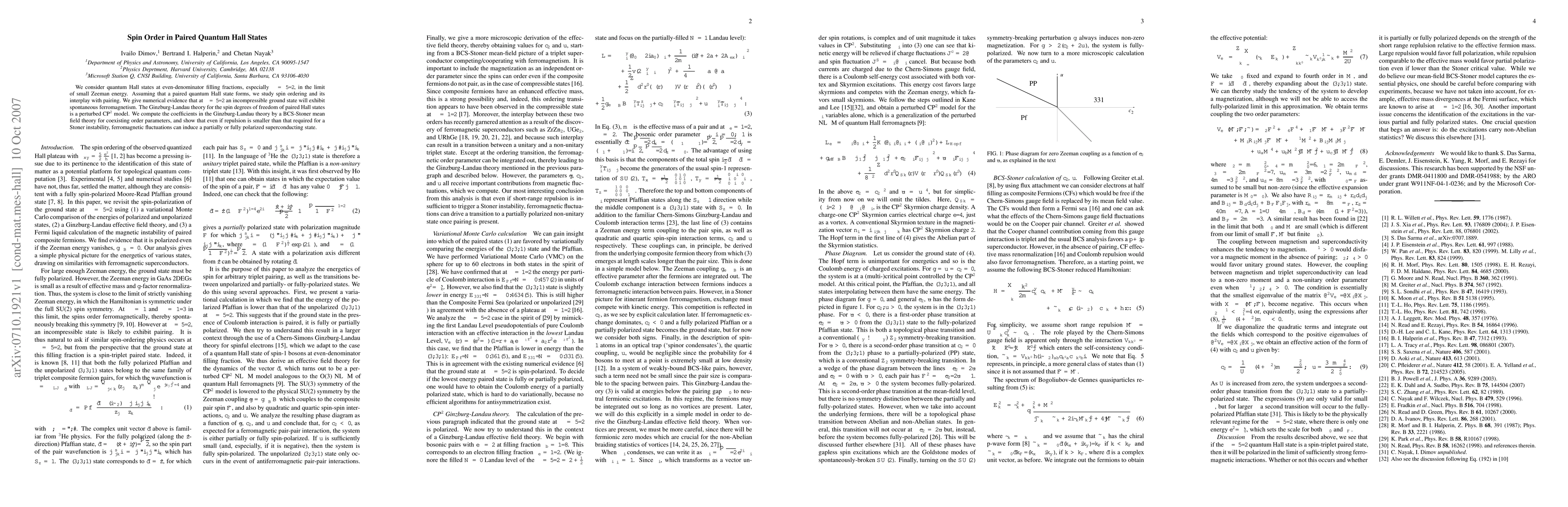 This paper investigates spin order in paired quantum Hall states at $\nu=5/2$, showing that despite weak repulsion, spontaneous ferromagnetism can emerge due to ferromagnetic fluctuations. The Ginzburg-Landau theory for these states is modeled as a perturbed CP$^2$ model, with computed coefficients indicating a partially or fully polarized superconducting state.
