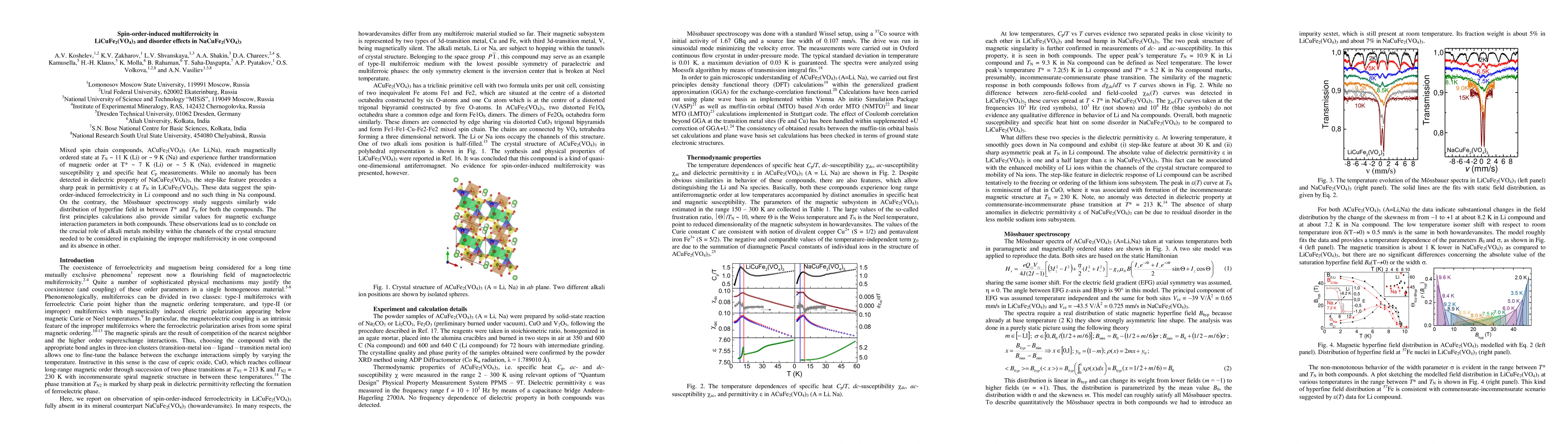 Mixed spin chain compounds, ACuFe2(VO4)3 (A= Li,Na), reach magnetically ordered state at TN ~ 11 K (Li) or ~ 9 K (Na) and experience further transformation of magnetic order at T* ~ 7 K (Li) or ~ 5 K (Na), evidenced in magnetic susceptibility chi and specific heat Cp measurements. While no anomaly has been detected in dielectric property of NaCuFe2(VO4)3, the step-like feature precedes a sharp peak in permittivity epsilon at TN in LiCuFe2(VO4)3. These data suggest the spin-order-induced ferroelectricity in Li compound and no such thing in Na compound. On the contrary, the Moessbauer spectroscopy study suggests similarly wide distribution of hyperfine field in between T* and TN for both the compounds. The first principles calculations also provide similar values for magnetic exchange interaction parameters in both compounds. These observations lead us to conclude on the crucial role of alkali metals mobility within the channels of the crystal structure needed to be considered in explaining the improper multiferroicity in one compound and its absence in other.