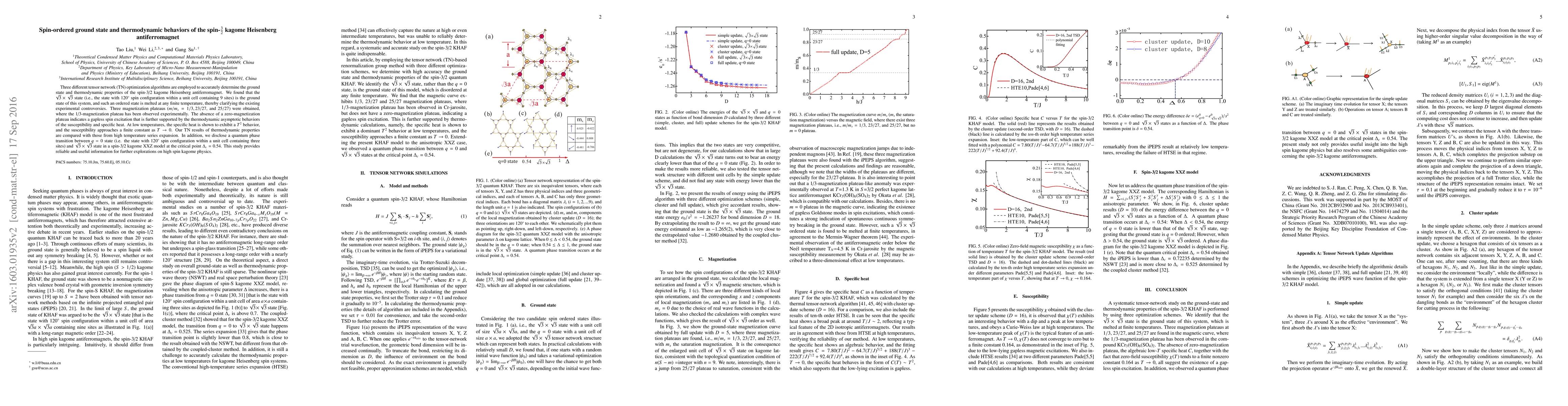 This paper uses tensor network optimization to determine the ground state and thermodynamic properties of the spin-3/2 kagome Heisenberg antiferromagnet, finding a $\sqrt{3} \times \sqrt{3}$ spin-ordered ground state that melts at finite temperatures, and observes a 1/3-magnetization plateau consistent with experiments.