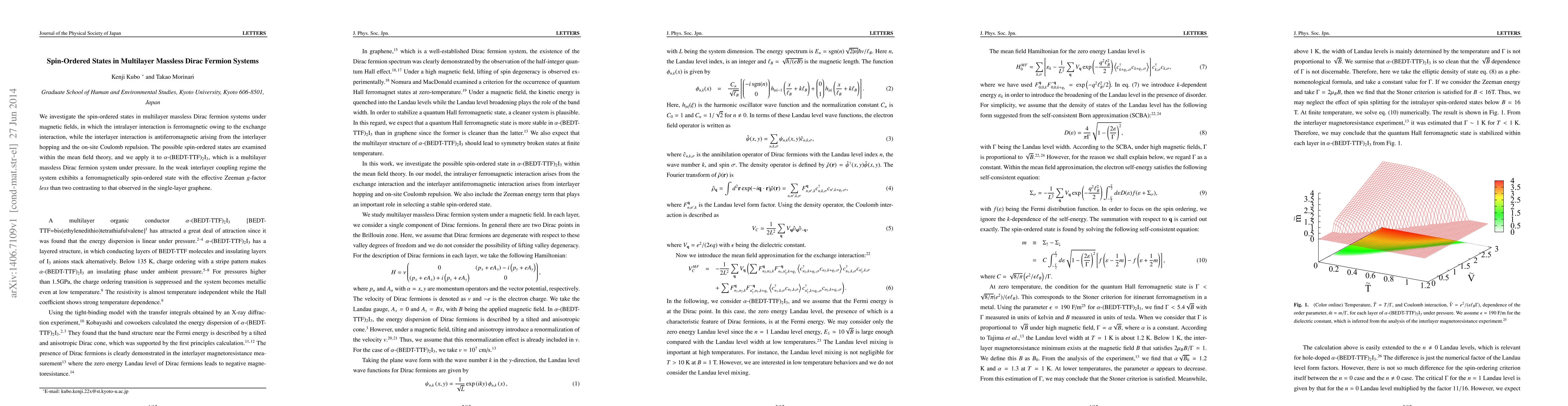 This paper examines spin-ordered states in multilayer massless Dirac fermion systems under magnetic fields, revealing a ferromagnetic intralayer interaction and antiferromagnetic interlayer interaction. Utilizing mean field theory, the study predicts a distinct ferromagnetic spin-ordered state with an effective Zeeman g-factor below two, differing from single-layer graphene.
