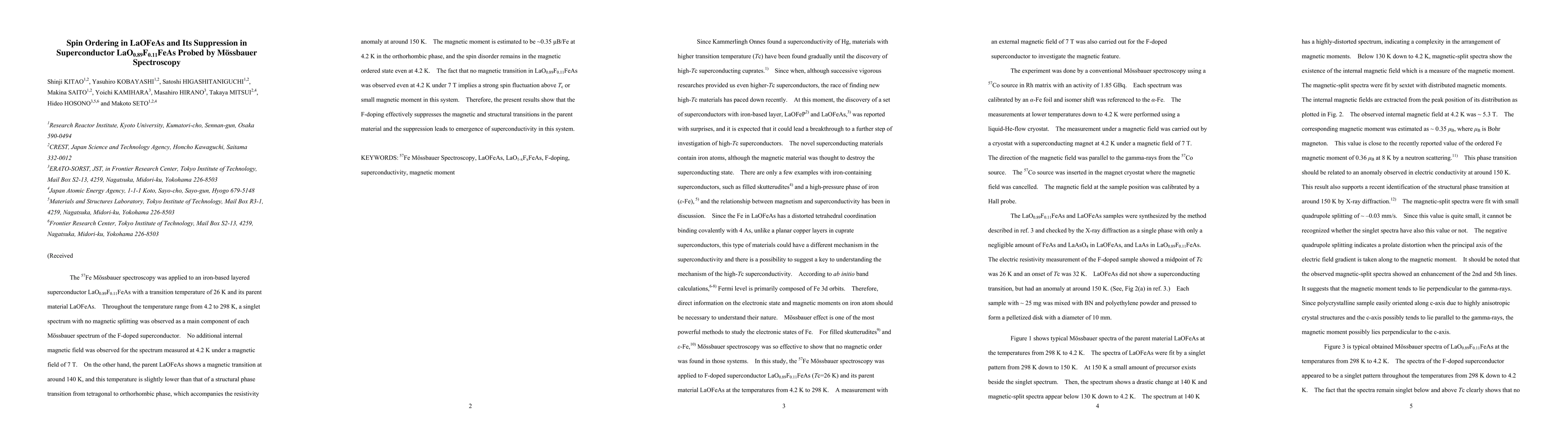 This study uses 57Fe Mössbauer spectroscopy to investigate spin ordering in the iron-based superconductor LaO0.89F0.11FeAs and its parent compound LaOFeAs. The doped superconductor shows no magnetic splitting, indicating suppression of magnetic ordering, while the parent compound exhibits a magnetic transition at 140 K. The findings suggest that fluorine doping effectively suppresses magnetism and structural transitions, facilitating superconductivity.
